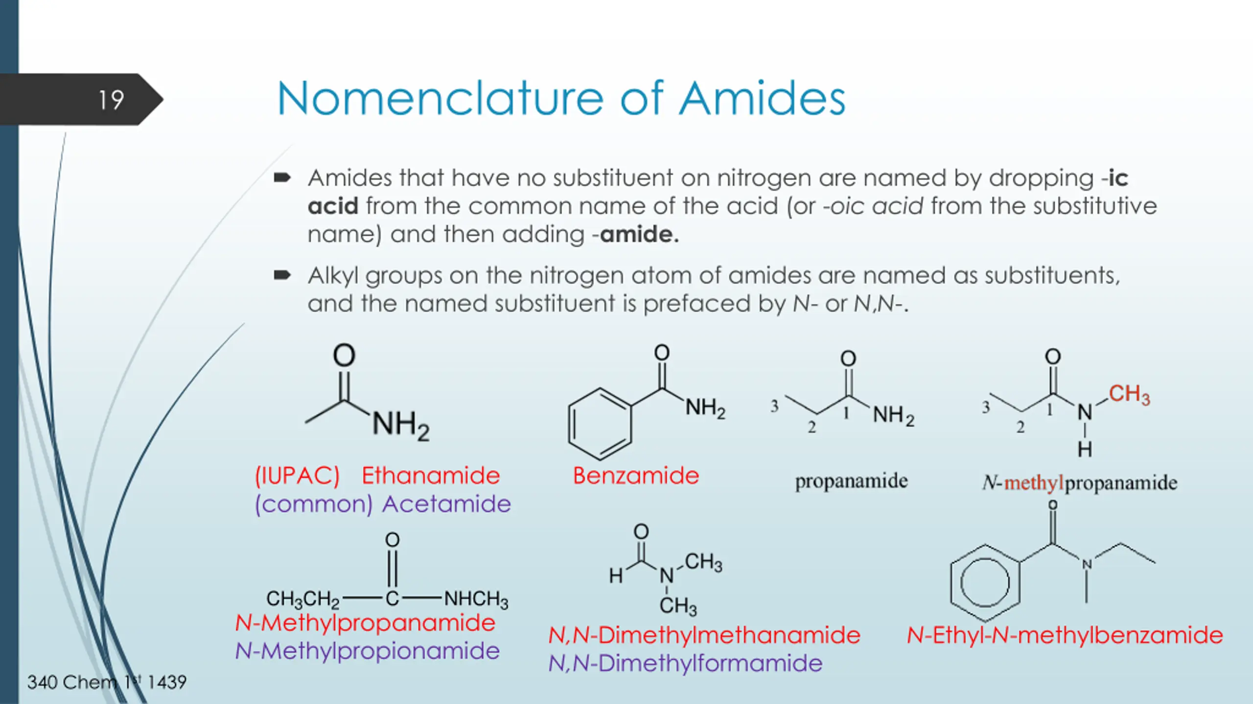 Nomenclature of Amides 19 Amides that have no substituent on nitrogen are named by dropping -ic acid from the common name of the acid (or -oic acid from the substitutive name) and then adding -amide. Alkyl groups on the nitrogen atom of amides are named as substituents, and the named substituent is prefaced by N- or N,N-. (IUPAC) Ethanamide Benzamide (common) Acetamide O CH3CH2 N-Methylpropanamide N-Methylpropionamide C NHCH3 N,N-Dimethylmethanamide N-Ethyl-N-methylbenzamide N,N-Dimethylformamide 340 Chem 1st 1439