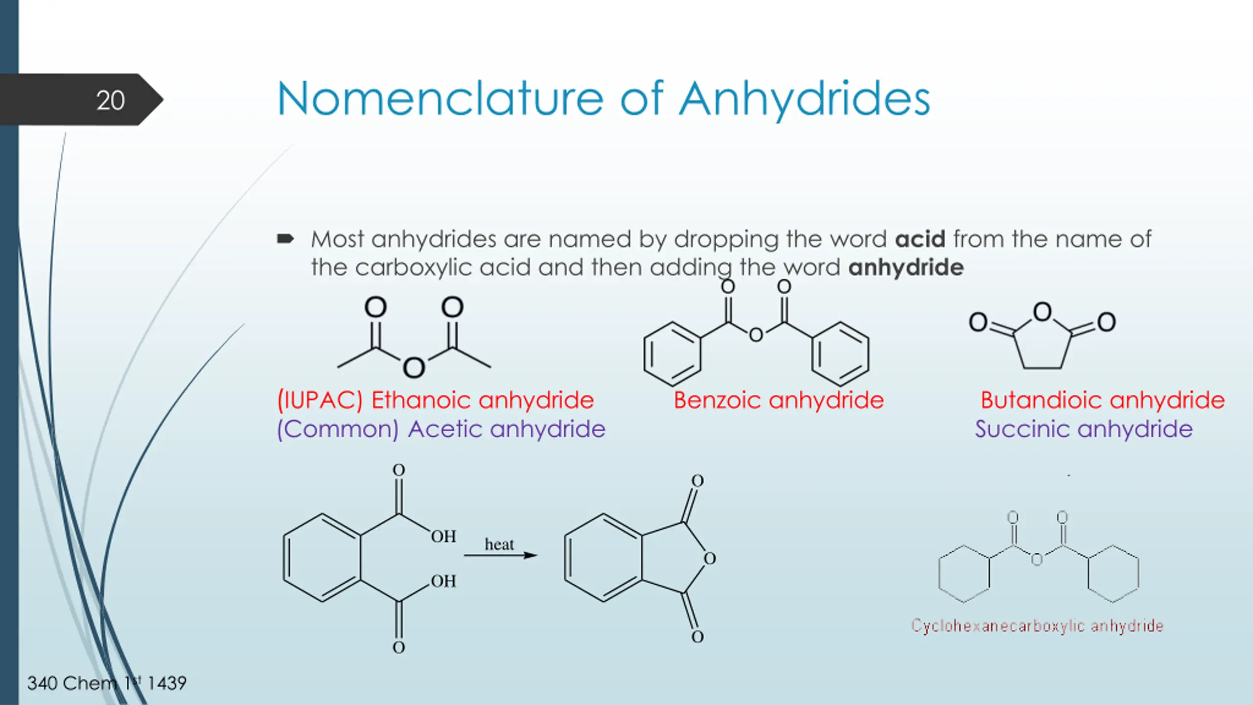 Nomenclature of Anhydrides 20 Most anhydrides are named by dropping the word acid from the name of the carboxylic acid and then adding the word anhydride (IUPAC) Ethanoic anhydride (Common) Acetic anhydride Benzoic anhydride Butandioic anhydride Succinic anhydride O O OH heat O OH O O 340 Chem 1st 1439