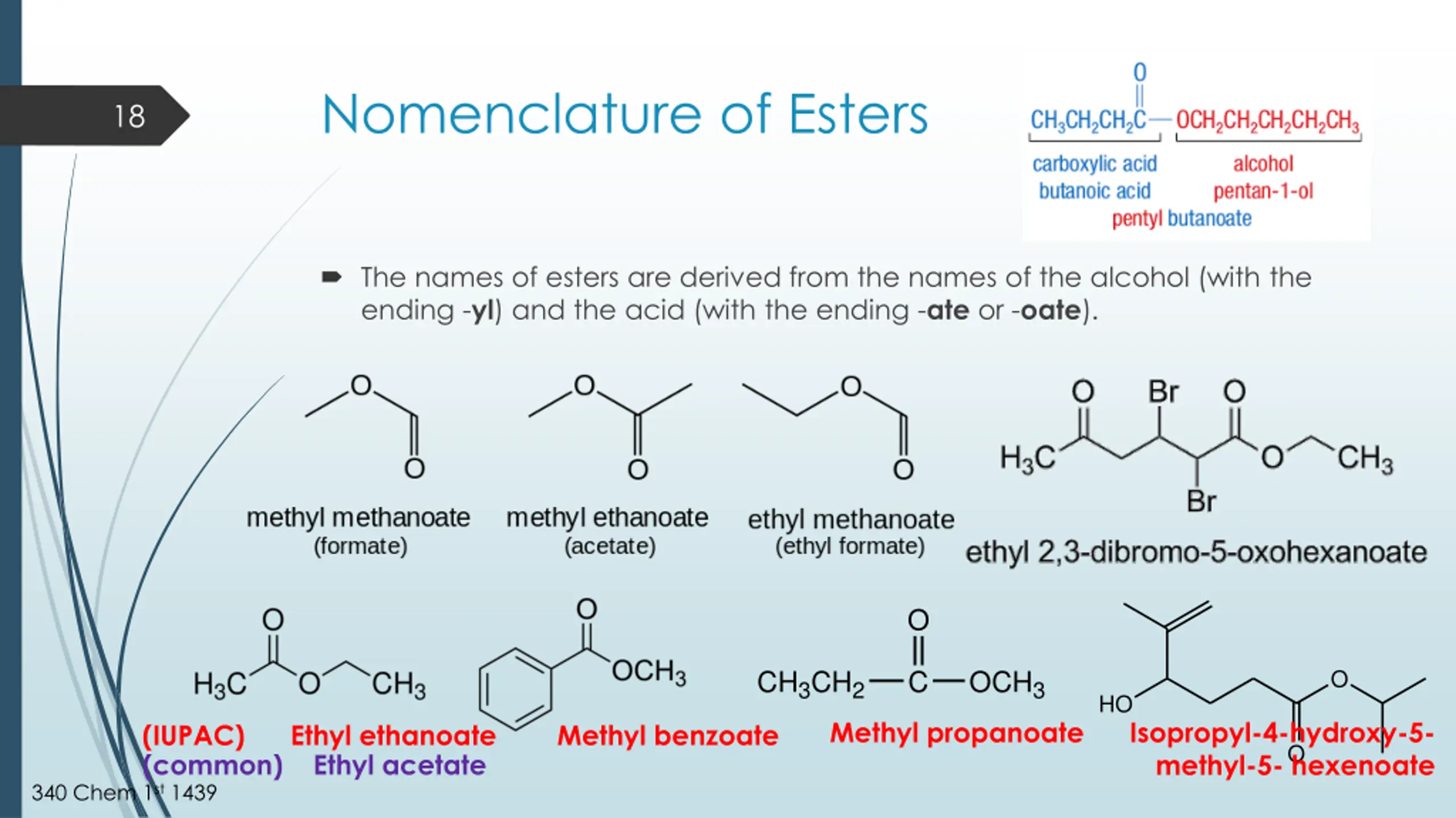 Nomenclature of Esters 18 The names of esters are derived from the names of the alcohol (with the ending -yl) and the acid (with the ending -ate or -oate). O CH3CH2 C OCH3 O HO Methyl propanoate Isopropyl-4-hydroxy-5- (IUPAC) Ethyl ethanoate Methyl benzoate (common) Ethyl acetate 340 Chem 1st 1439 O methyl-5- hexenoate