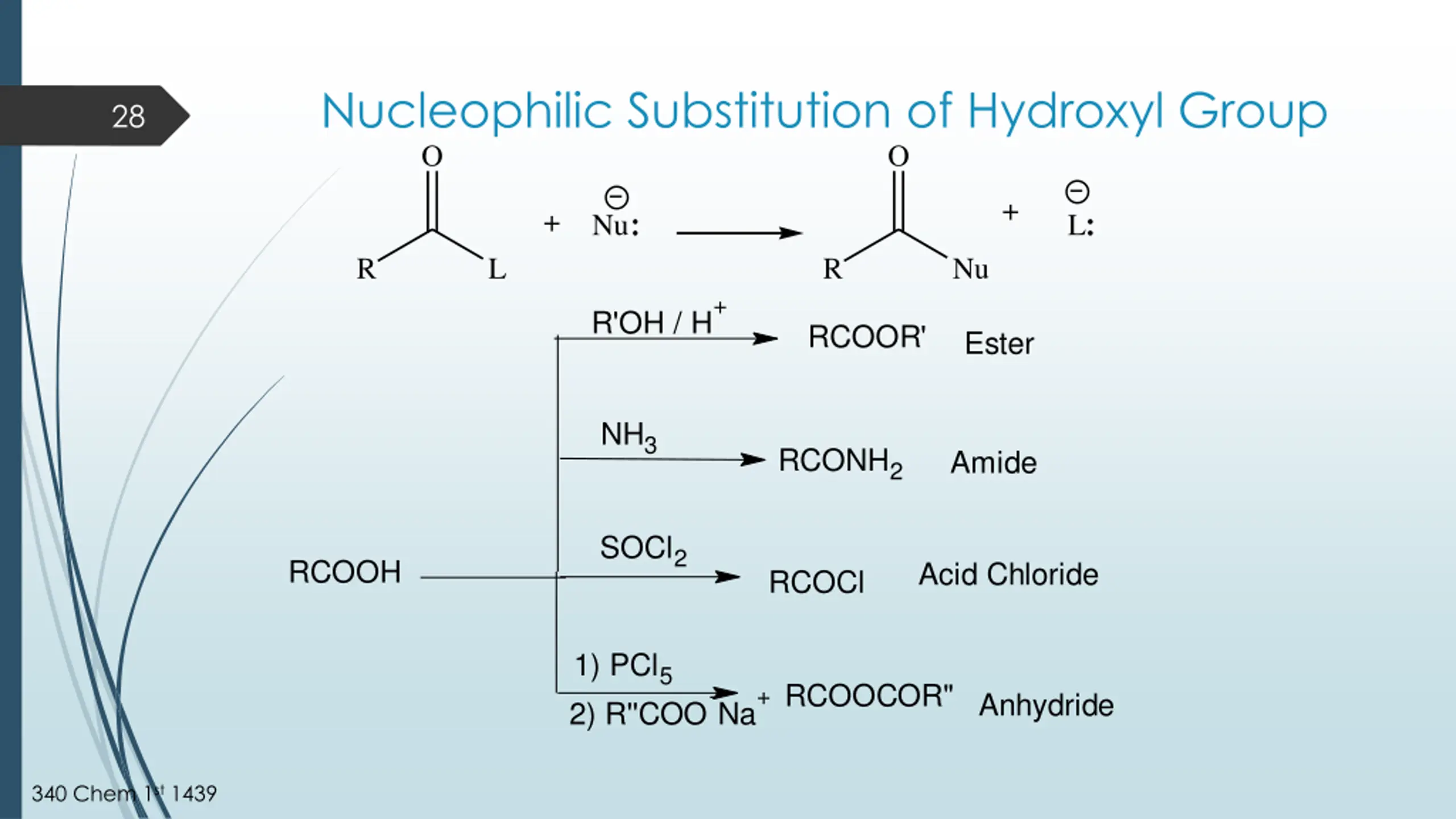 Nucleophilic Substitution of Hydroxyl Group O 28 O + + Nu L R L R Nu R'OH / H+ RCOOR' Ester NH3 RCONH2 Amide SOCl2 RCOOH Acid Chloride RCOCl 1) PCl5 2) R''COO-Na+ RCOOCOR" Anhydride 340 Chem 1st 1439