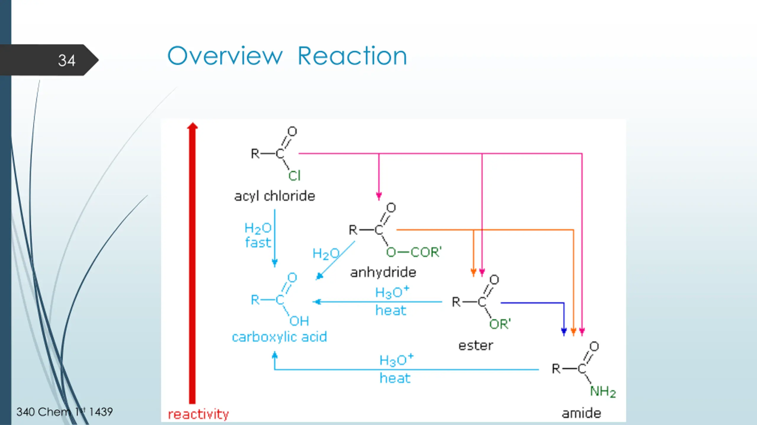 Reaction of Derivatives of carboxylic acid 33 On hydrolysis (reaction with H2O) all carboxylic acid derivatves convert to carboxylic acid. O H3O+ R O O R H3O+ O R O O H R O O H3O+ R NH2 or eq NaOH/H3O+ O H3O+ R Cl 340 Chem 1st 1439