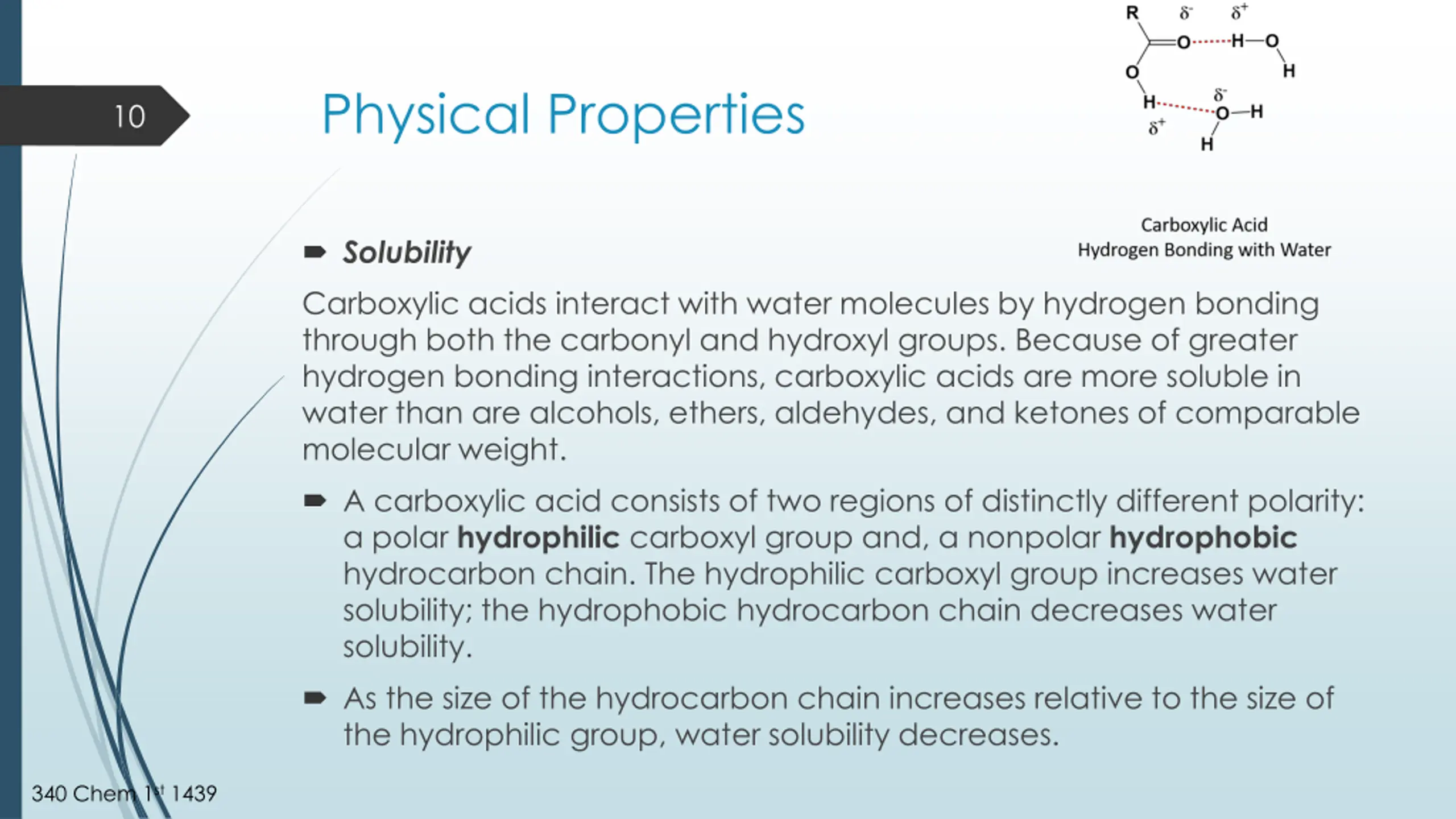 Physical Properties 10 Solubility Carboxylic acids interact with water molecules by hydrogen bonding through both the carbonyl and hydroxyl groups. Because of greater hydrogen bonding interactions, carboxylic acids are more soluble in water than are alcohols, ethers, aldehydes, and ketones of comparable molecular weight. A carboxylic acid consists of two regions of distinctly different polarity: a polar hydrophilic carboxyl group and, a nonpolar hydrophobic hydrocarbon chain. The hydrophilic carboxyl group increases water solubility; the hydrophobic hydrocarbon chain decreases water solubility. As the size of the hydrocarbon chain increases relative to the size of the hydrophilic group, water solubility decreases. 340 Chem 1st 1439