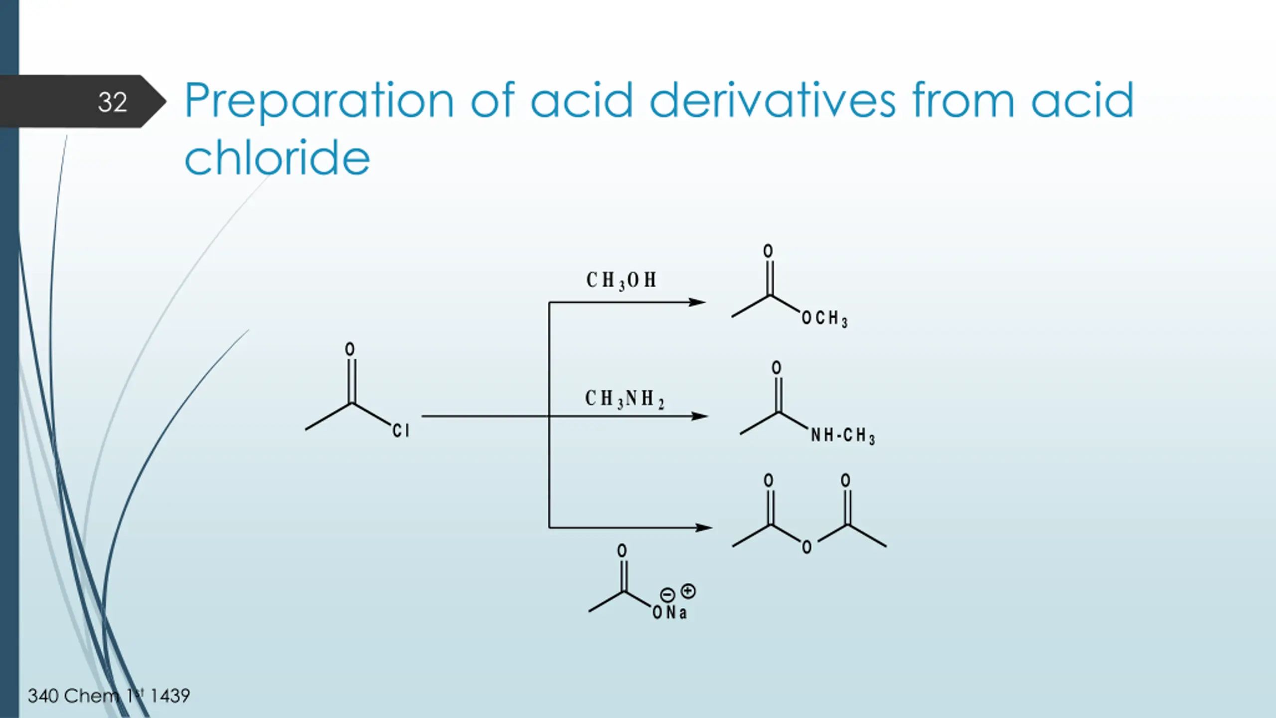 Preparation of acid derivatives from acid chloride 32 O C H3O H O C H3 O O C H3N H2 C l N H -C H3 O O O O O N a 340 Chem 1st 1439