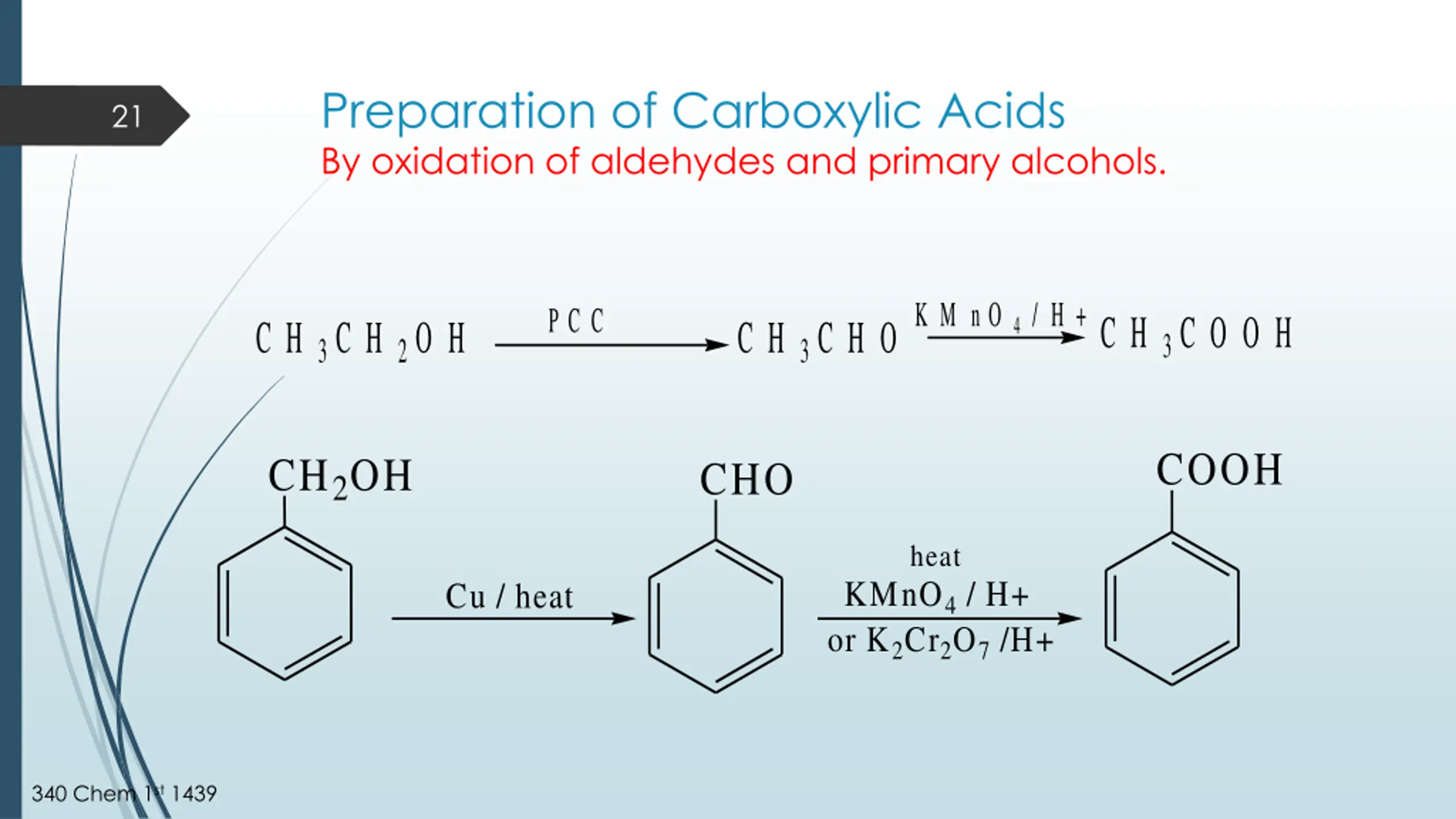 Preparation of Carboxylic Acids By oxidation of aldehydes and primary alcohols. 21 K M n O4 / H + P C C C H3C O O H C H3C H2O H C H3C H O COOH CH2OH CHO heat KMnO4 / H+ or K2Cr2O7 /H+ Cu / heat 340 Chem 1st 1439