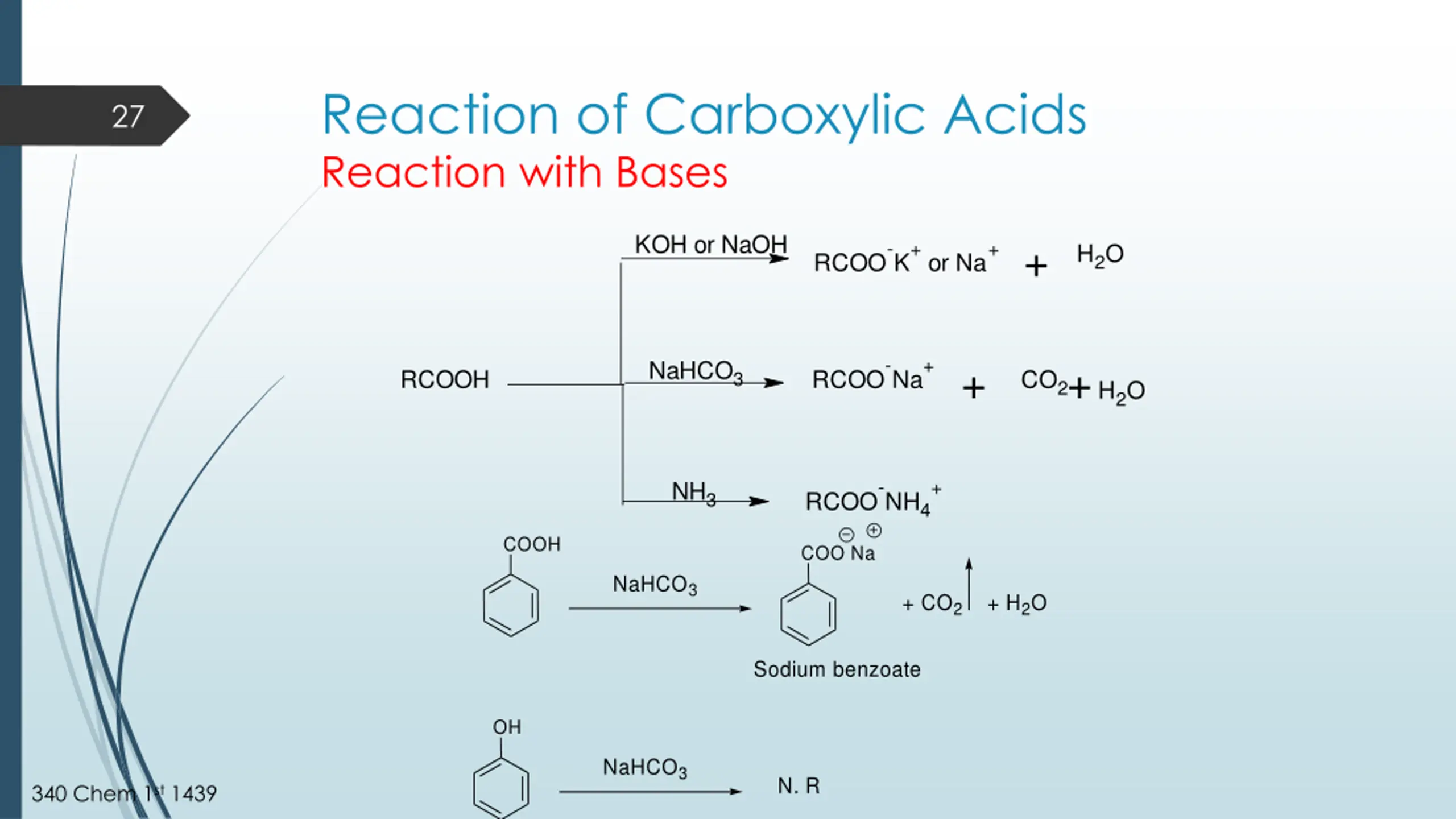 Reaction of Carboxylic Acids Reaction with Bases 27 KOH or NaOH RCOO-K+ or Na++ H2O RCOO-Na++ NaHCO3 + RCOOH CO2 H2O RCOO-NH4 + NH3 COOH COO Na NaHCO3 + CO2 + H2O Sodium benzoate OH NaHCO3 N. R 340 Chem 1st 1439