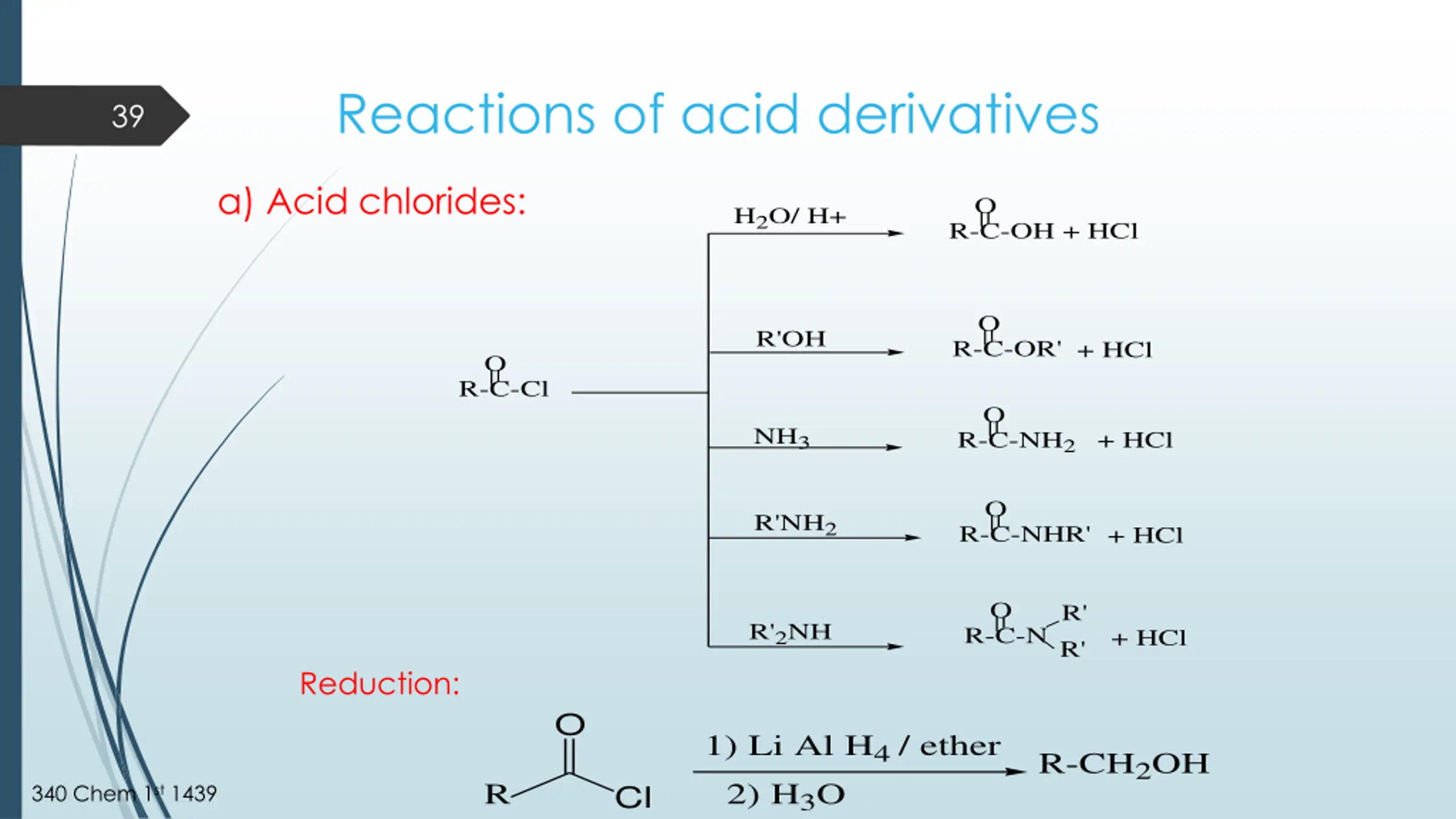 Reactions of acid derivatives 39 a) Acid chlorides: O H2O/ H+ R-C-OH + HCl O R'OH R-C-OR' + HCl O R-C-Cl O NH3 R-C-NH2 + HCl O R'NH2 R-C-NHR' + HCl O R' R' R'2NH R-C-N + HCl Reduction: O 1) Li Al H4 / ether 2) H3O R-CH2OH R 340 Chem 1st 1439 Cl