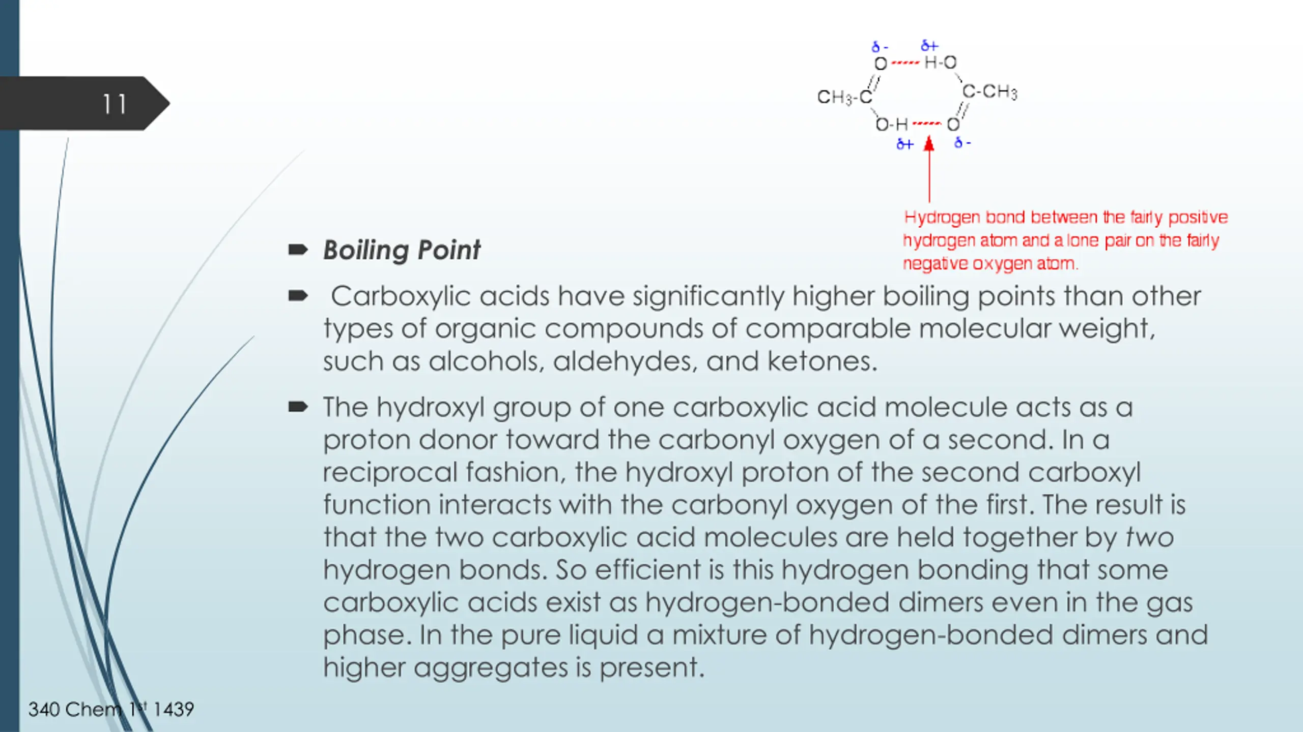 11 Boiling Point Carboxylic acids have significantly higher boiling points than other types of organic compounds of comparable molecular weight, such as alcohols, aldehydes, and ketones. The hydroxyl group of one carboxylic acid molecule acts as a proton donor toward the carbonyl oxygen of a second. In a reciprocal fashion, the hydroxyl proton of the second carboxyl function interacts with the carbonyl oxygen of the first. The result is that the two carboxylic acid molecules are held together by two hydrogen bonds. So efficient is this hydrogen bonding that some carboxylic acids exist as hydrogen-bonded dimers even in the gas phase. In the pure liquid a mixture of hydrogen-bonded dimers and higher aggregates is present. 340 Chem 1st 1439
