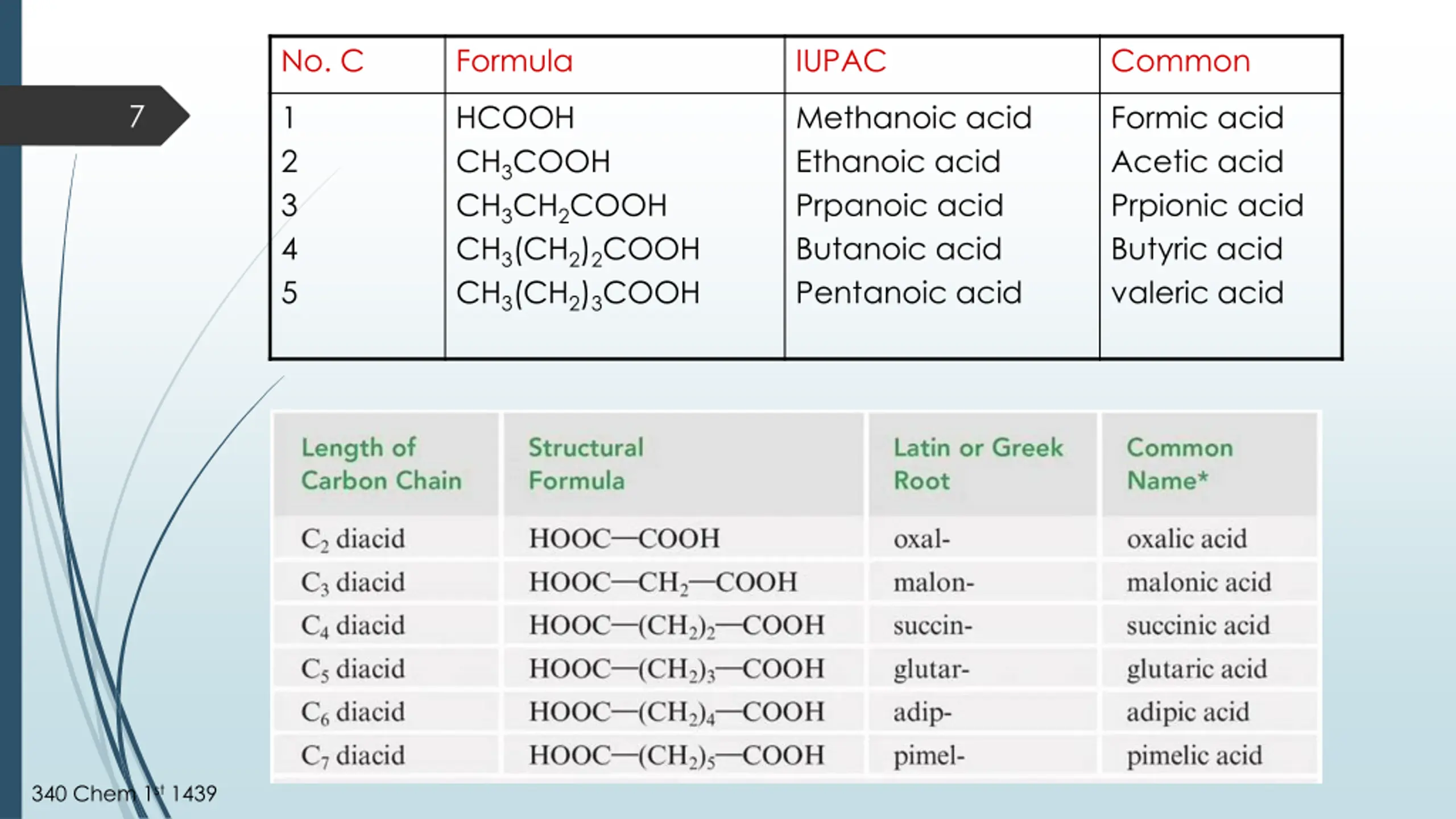 No. C Formula IUPAC Common 7 1 2 3 4 5 HCOOH CH3COOH CH3CH2COOH CH3(CH2)2COOH CH3(CH2)3COOH Methanoic acid Ethanoic acid Prpanoic acid Butanoic acid Pentanoic acid Formic acid Acetic acid Prpionic acid Butyric acid valeric acid 340 Chem 1st 1439