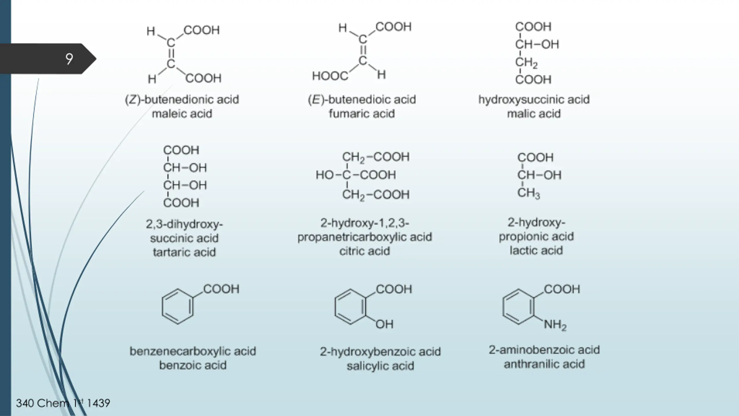 COOH COOH COOH COOH 8 COOH COOH 1,4-Benzenedicarboxylic acid 1,2-Benzenedicarboxylic acid 1,3-Benzenedicarboxylic acid (Terephthalic acid) (Phthalic acid) (Isophthalic acid) trans-3-Phenylpropenoic acid (Cinnamic acid) COOH 3- Cyclohexene carboxylic acid 340 Chem 1st 1439