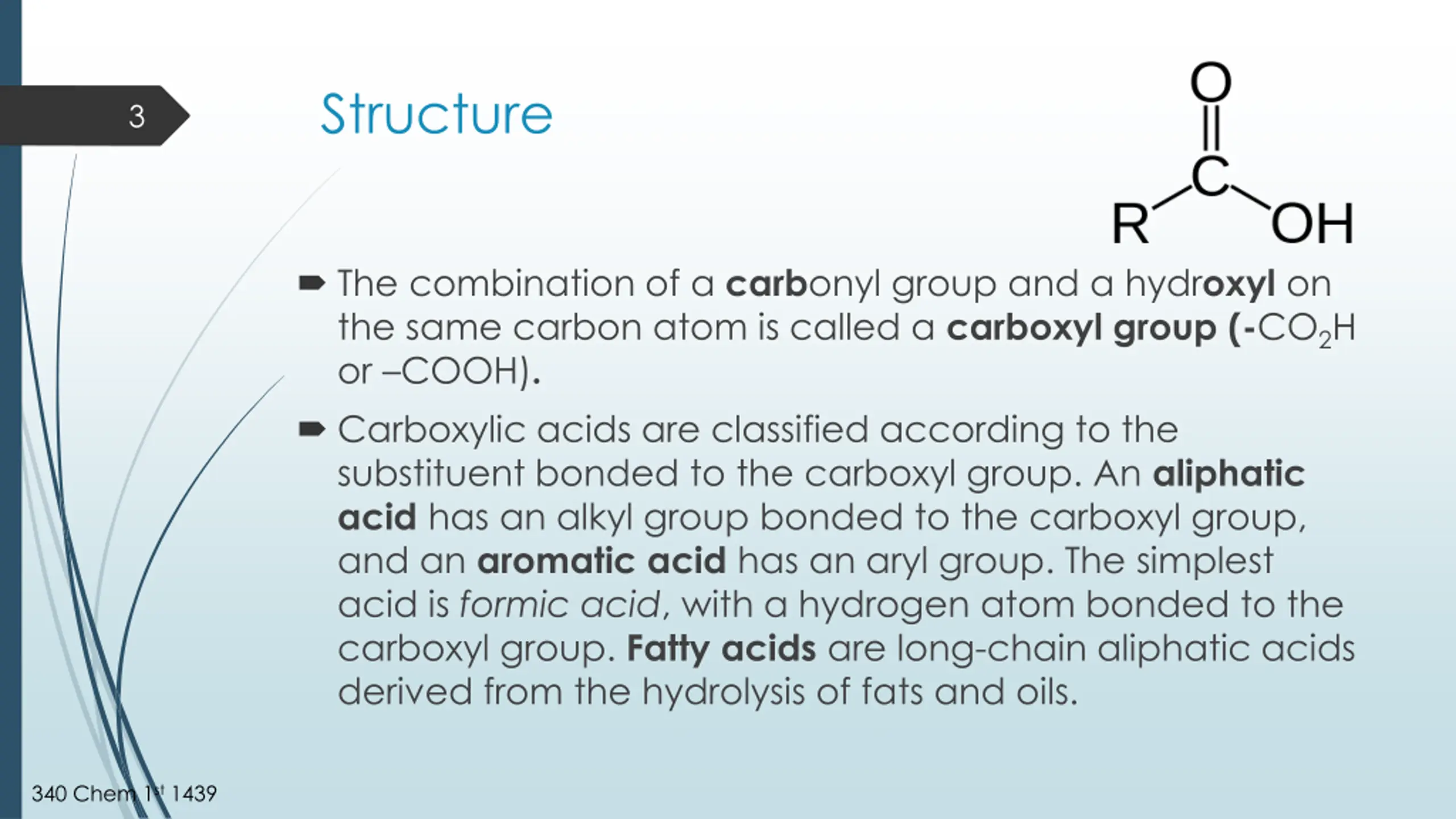 Structure 3 The combination of a carbonyl group and a hydroxyl on the same carbon atom is called a carboxyl group (-CO2H or COOH). Carboxylic acids are classified according to the substituent bonded to the carboxyl group. An aliphatic acid has an alkyl group bonded to the carboxyl group, and an aromatic acid has an aryl group. The simplest acid is formic acid, with a hydrogen atom bonded to the carboxyl group. Fatty acids are long-chain aliphatic acids derived from the hydrolysis of fats and oils. 340 Chem 1st 1439