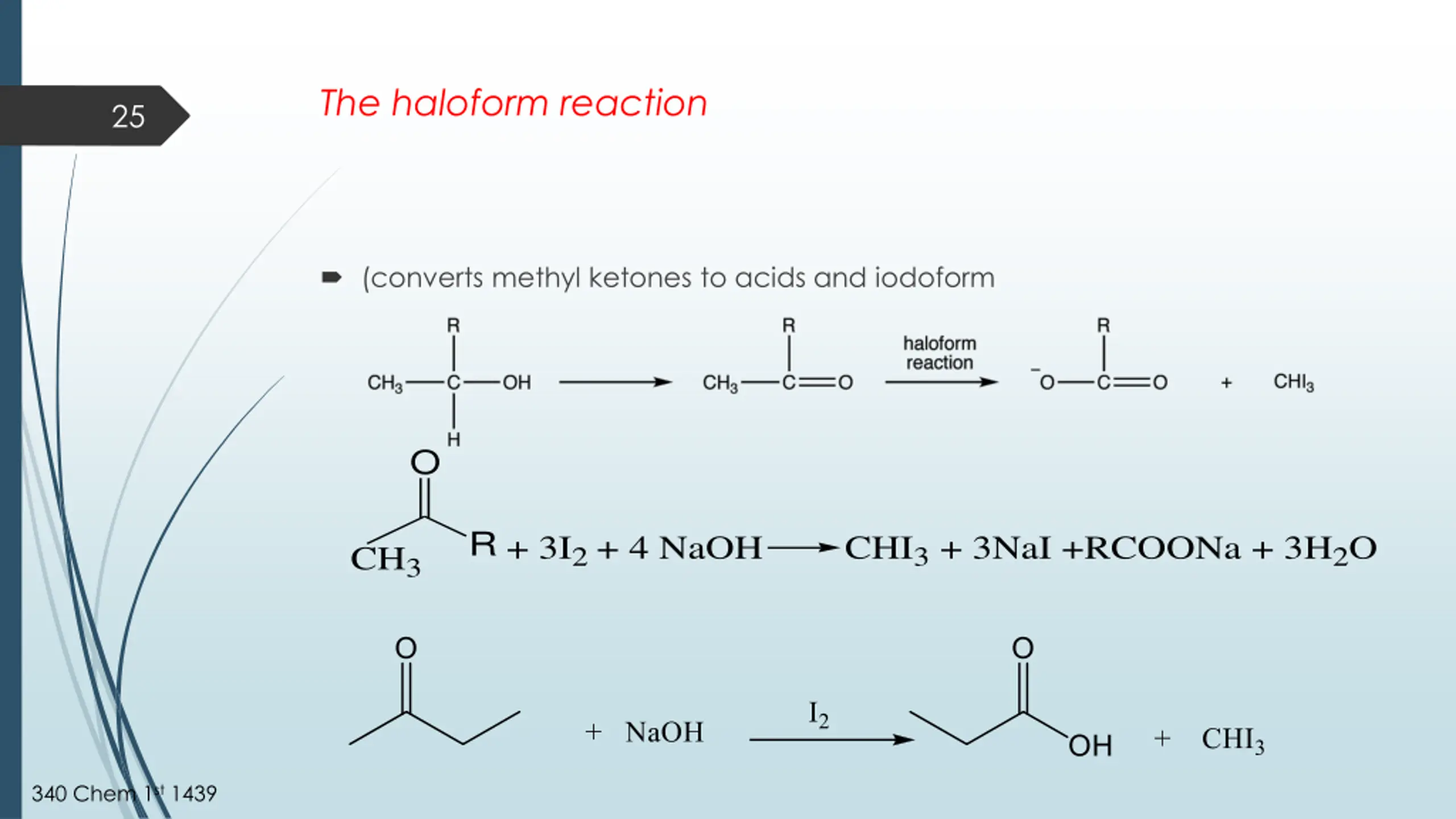 The haloform reaction 25 (converts methyl ketones to acids and iodoform O R + 3I2 + 4 NaOH CHI3 + 3NaI +RCOONa + 3H2O CH3 340 Chem 1st 1439