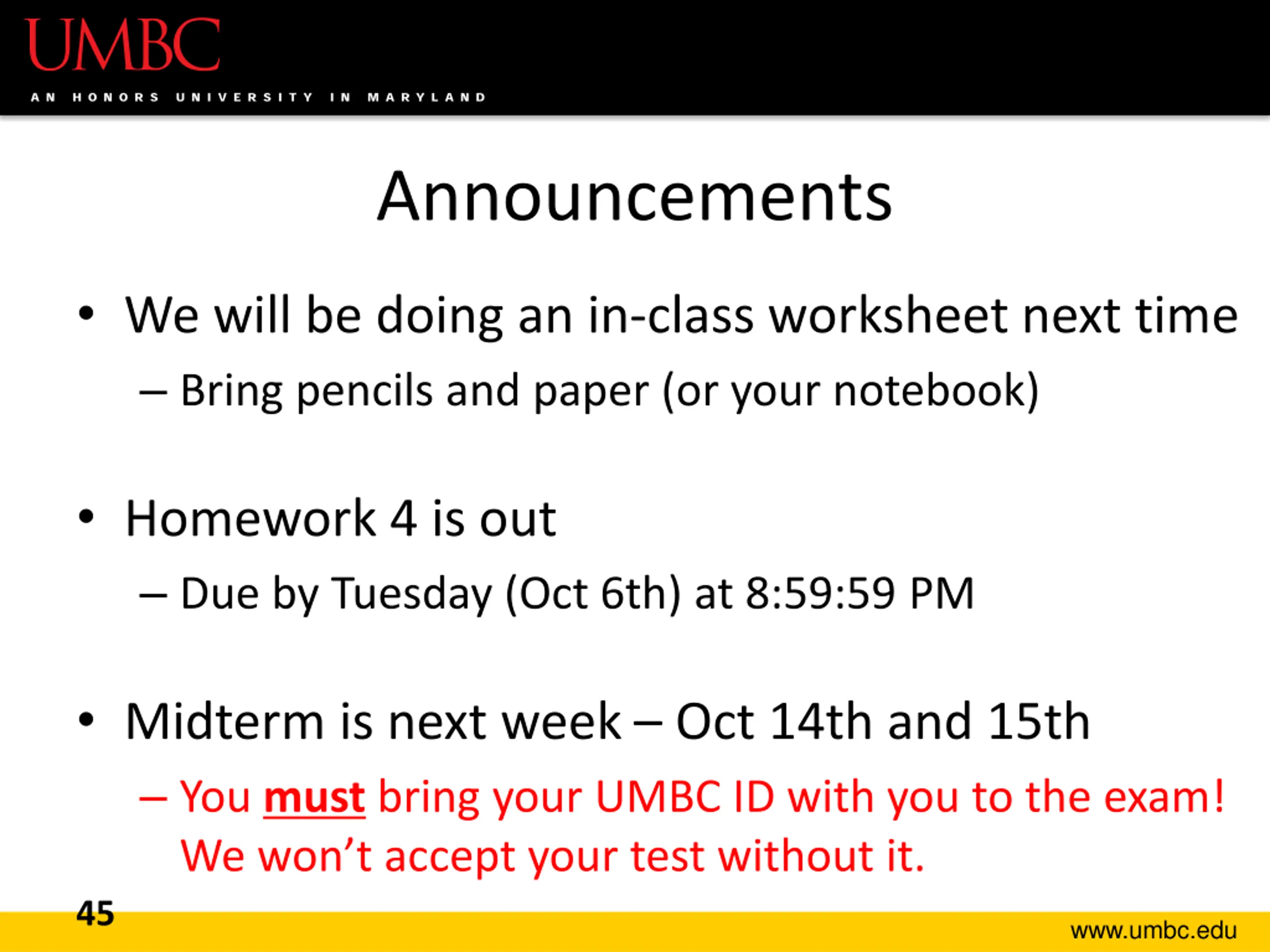 Announcements We will be doing an in-class worksheet next time Bring pencils and paper (or your notebook) Homework 4 is out Due by Tuesday (Oct 6th) at 8:59:59 PM Midterm is next week Oct 14th and 15th You must bring your UMBC ID with you to the exam! We won t accept your test without it. 45 www.umbc.edu