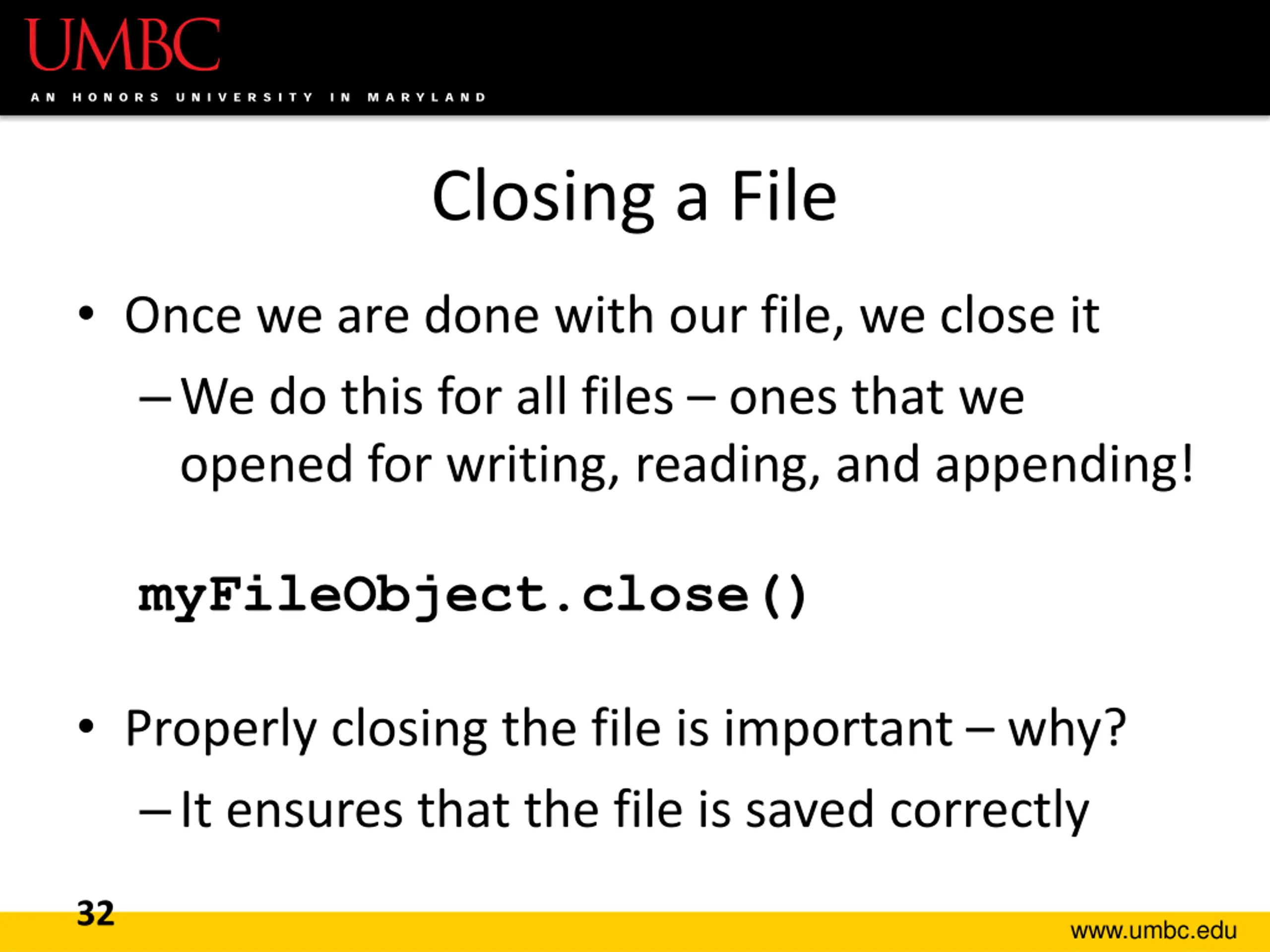 Closing a File Once we are done with our file, we close it We do this for all files ones that we opened for writing, reading, and appending! myFileObject.close() Properly closing the file is important why? It ensures that the file is saved correctly 32 www.umbc.edu