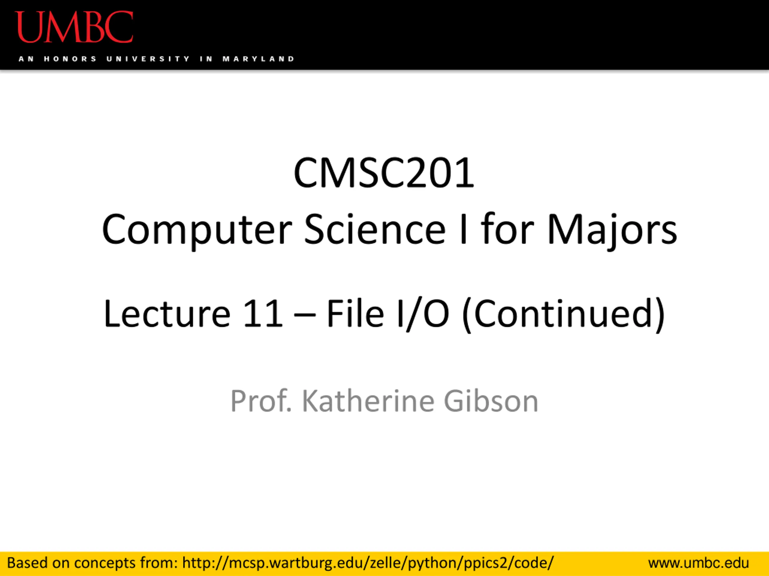 CMSC201 Computer Science I for Majors Lecture 11 File I/O (Continued) Prof. Katherine Gibson www.umbc.edu Based on concepts from: http://mcsp.wartburg.edu/zelle/python/ppics2/code/