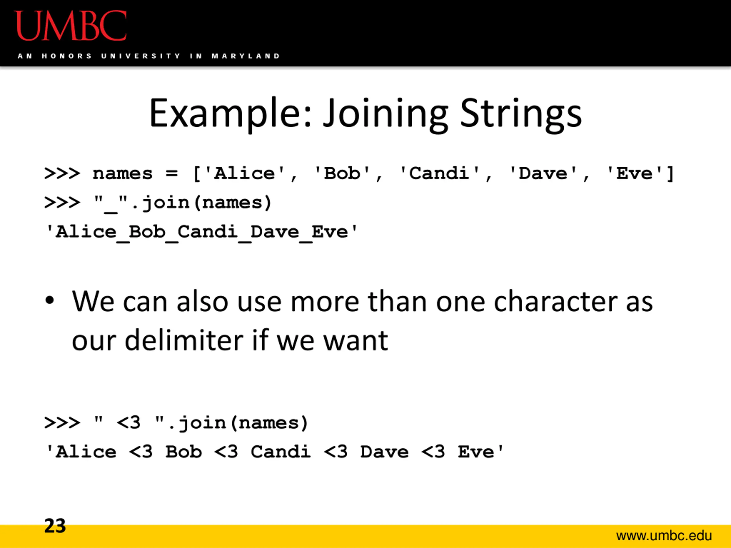 Example: Joining Strings >>> names = ['Alice', 'Bob', 'Candi', 'Dave', 'Eve'] >>> "_".join(names) 'Alice_Bob_Candi_Dave_Eve' We can also use more than one character as our delimiter if we want >>> " <3 ".join(names) 'Alice <3 Bob <3 Candi <3 Dave <3 Eve' 23 www.umbc.edu