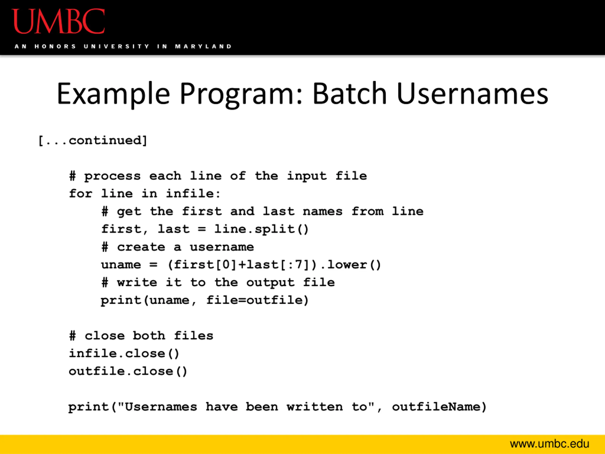 Example Program: Batch Usernames [...continued] # process each line of the input file for line in infile: # get the first and last names from line first, last = line.split() # create a username uname = (first[0]+last[:7]).lower() # write it to the output file print(uname, file=outfile) # close both files infile.close() outfile.close() print("Usernames have been written to", outfileName) www.umbc.edu