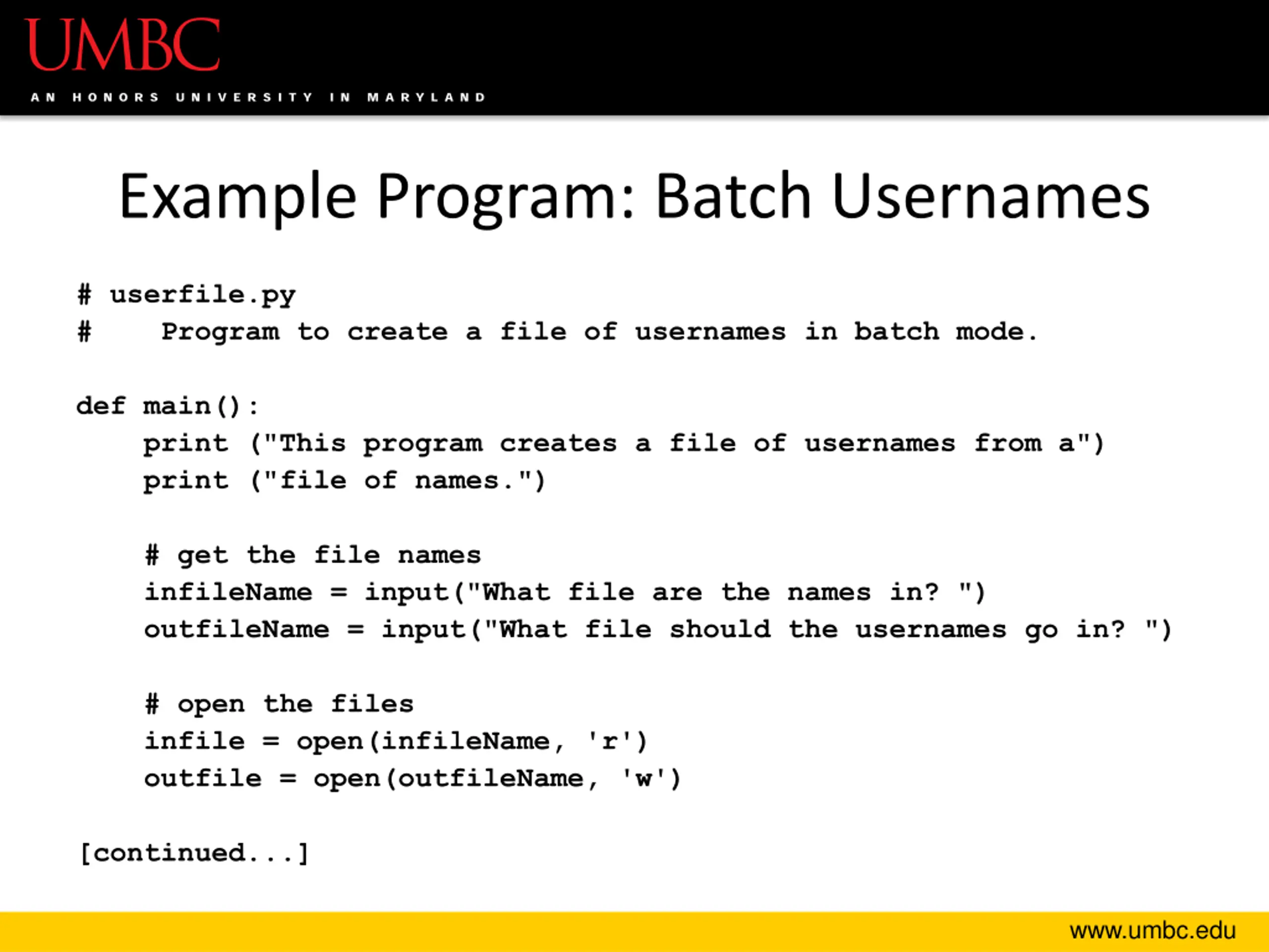 Example Program: Batch Usernames # userfile.py # Program to create a file of usernames in batch mode. def main(): print ("This program creates a file of usernames from a") print ("file of names.") # get the file names infileName = input("What file are the names in? ") outfileName = input("What file should the usernames go in? ") # open the files infile = open(infileName, 'r') outfile = open(outfileName, 'w') [continued...] www.umbc.edu