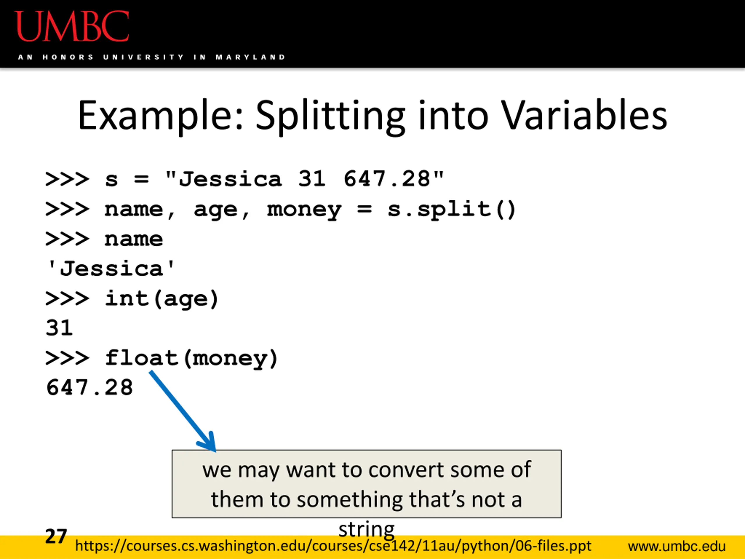 Example: Splitting into Variables >>> s = "Jessica 31 647.28" >>> name, age, money = s.split() >>> name 'Jessica' >>> int(age) 31 >>> float(money) 647.28 we may want to convert some of them to something that s not a string https://courses.cs.washington.edu/courses/cse142/11au/python/06-files.ppt 27 www.umbc.edu