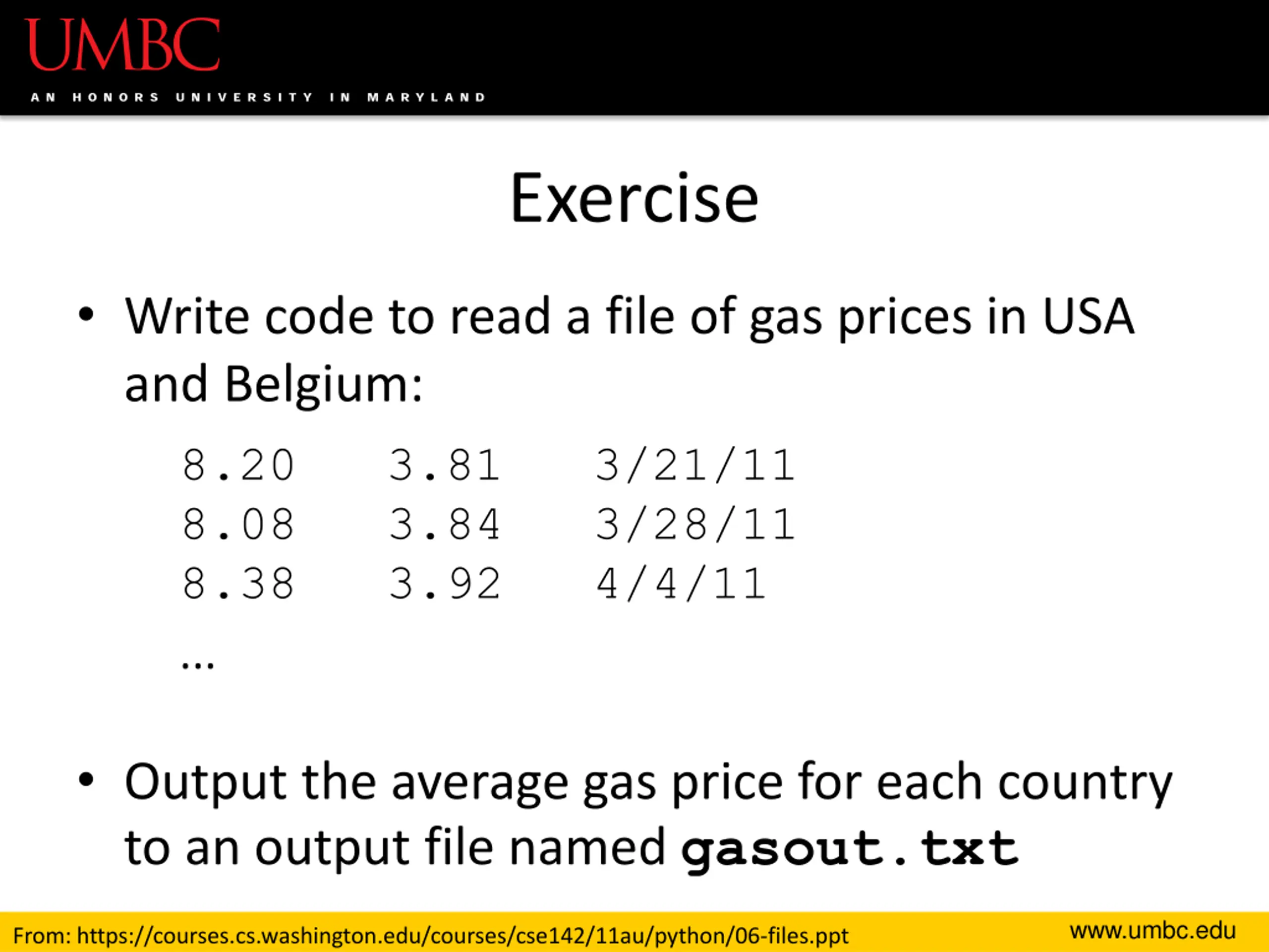 Exercise Write code to read a file of gas prices in USA and Belgium: 8.20 3.81 3/21/11 8.08 3.84 3/28/11 8.38 3.92 4/4/11 ... Output the average gas price for each country to an output file named gasout.txt www.umbc.edu From: https://courses.cs.washington.edu/courses/cse142/11au/python/06-files.ppt