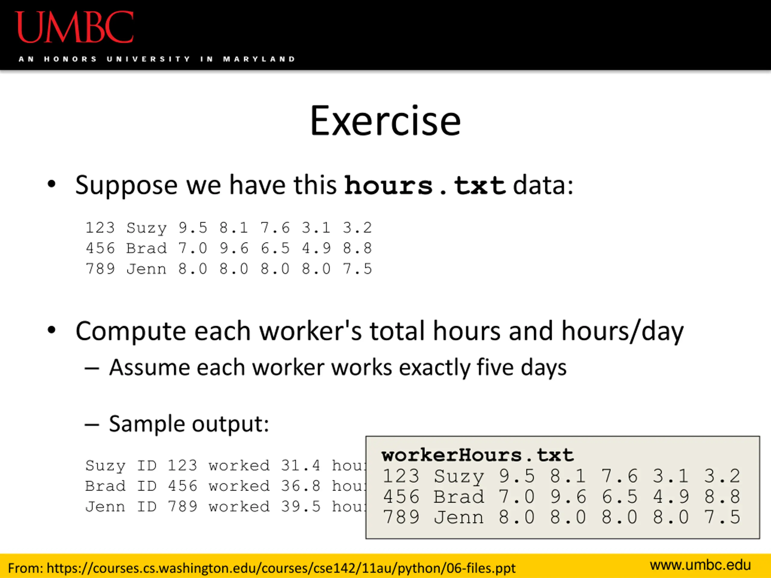 Exercise Suppose we have this hours.txt data: 123 Suzy 9.5 8.1 7.6 3.1 3.2 456 Brad 7.0 9.6 6.5 4.9 8.8 789 Jenn 8.0 8.0 8.0 8.0 7.5 Compute each worker's total hours and hours/day Assume each worker works exactly five days Sample output: workerHours.txt 123 Suzy 9.5 8.1 7.6 3.1 3.2 456 Brad 7.0 9.6 6.5 4.9 8.8 789 Jenn 8.0 8.0 8.0 8.0 7.5 Suzy ID 123 worked 31.4 hours: 6.3 / day Brad ID 456 worked 36.8 hours: 7.36 / day Jenn ID 789 worked 39.5 hours: 7.9 / day www.umbc.edu From: https://courses.cs.washington.edu/courses/cse142/11au/python/06-files.ppt