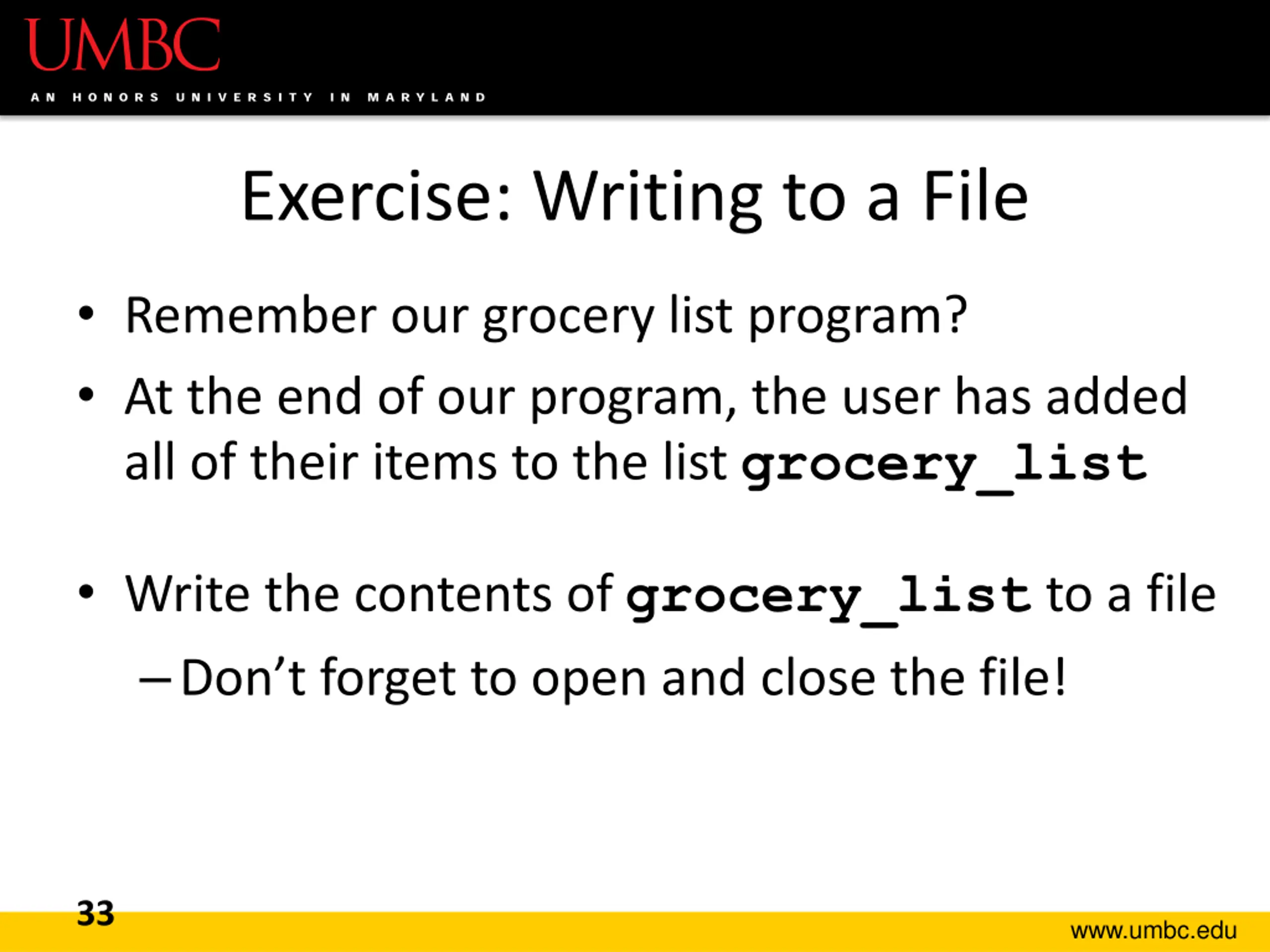 Exercise: Writing to a File Remember our grocery list program? At the end of our program, the user has added all of their items to the list grocery_list Write the contents of grocery_list to a file Don t forget to open and close the file! 33 www.umbc.edu
