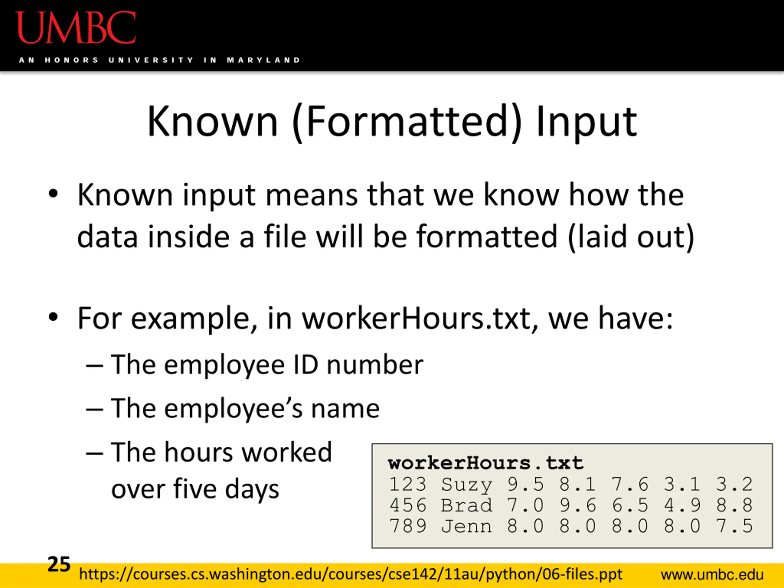 Known (Formatted) Input Known input means that we know how the data inside a file will be formatted (laid out) For example, in workerHours.txt, we have: The employee ID number The employee s name The hours worked over five days workerHours.txt 123 Suzy 9.5 8.1 7.6 3.1 3.2 456 Brad 7.0 9.6 6.5 4.9 8.8 789 Jenn 8.0 8.0 8.0 8.0 7.5 25 www.umbc.edu https://courses.cs.washington.edu/courses/cse142/11au/python/06-files.ppt
