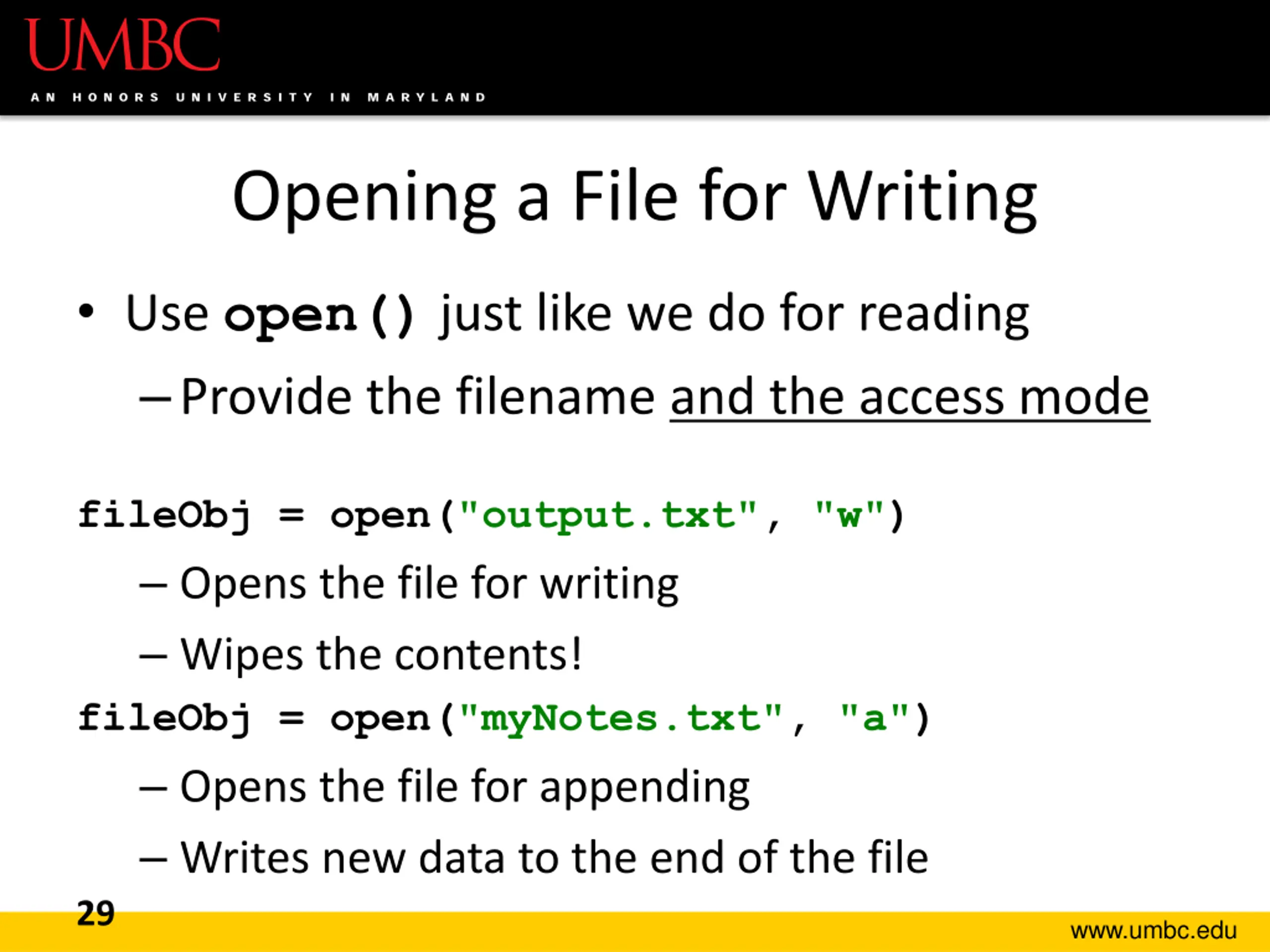 Opening a File for Writing Use open() just like we do for reading Provide the filename and the access mode fileObj = open("output.txt", "w") Opens the file for writing Wipes the contents! fileObj = open("myNotes.txt", "a") Opens the file for appending Writes new data to the end of the file 29 www.umbc.edu