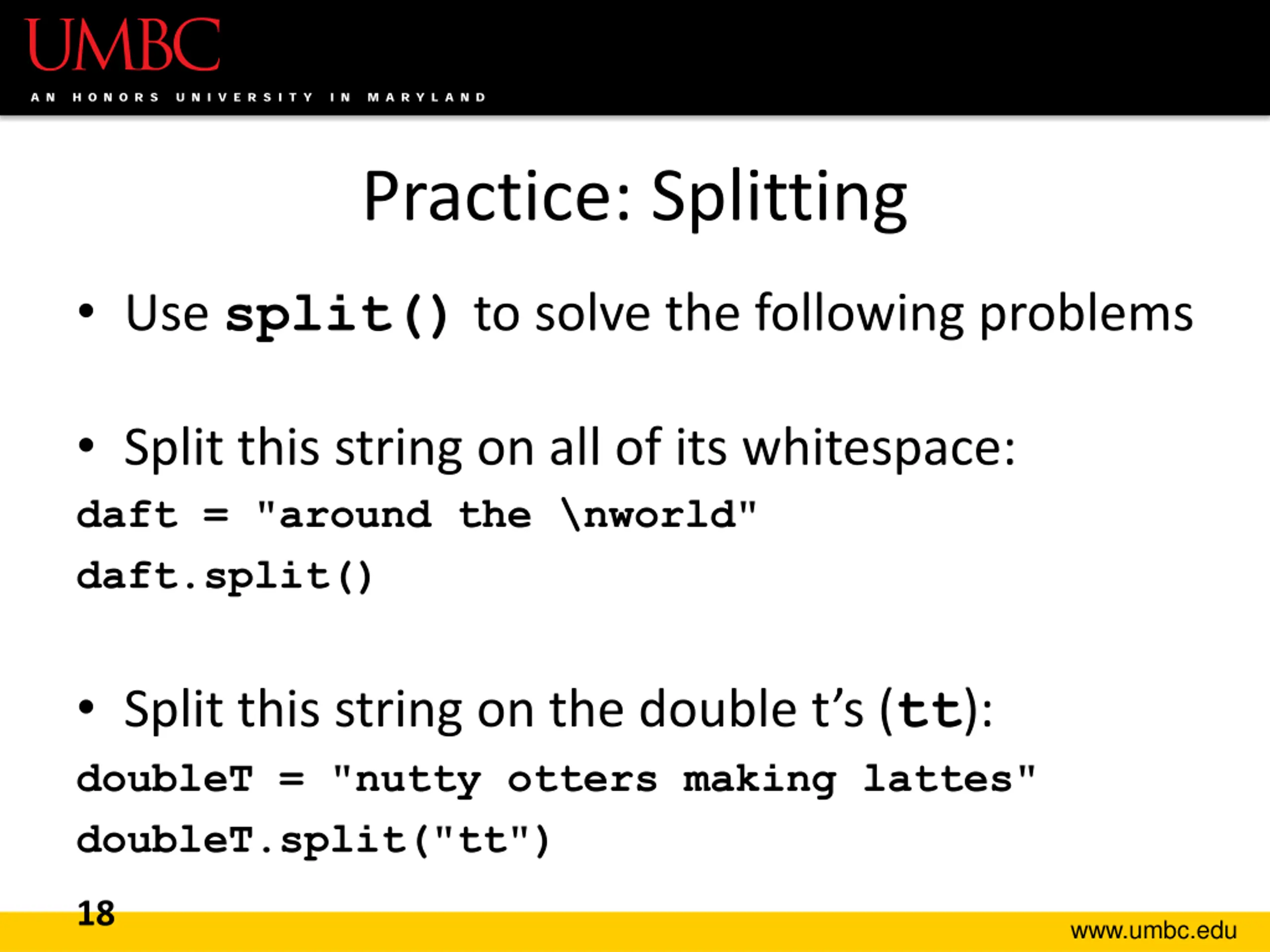 Practice: Splitting Use split() to solve the following problems Split this string on all of its whitespace: daft = "around the \nworld" Split this string on the double t s (tt): doubleT = "nutty otters making lattes" 17 www.umbc.edu