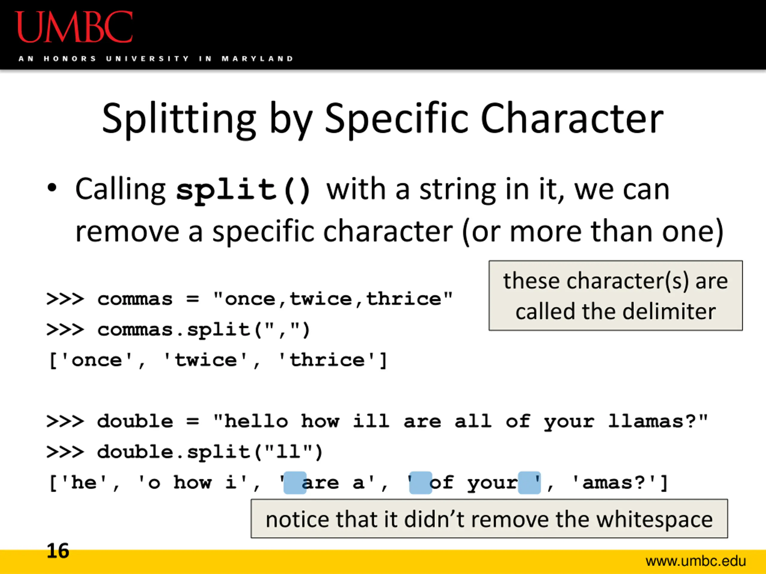 Splitting by Specific Character Calling split() with a string in it, we can remove a specific character (or more than one) these character(s) are called the delimiter >>> commas = "once,twice,thrice" >>> commas.split(",") ['once', 'twice', 'thrice'] >>> double = "hello how ill are all of your llamas?" >>> double.split("ll") ['he', 'o how i', ' are a', ' of your ', 'amas?'] 15 www.umbc.edu