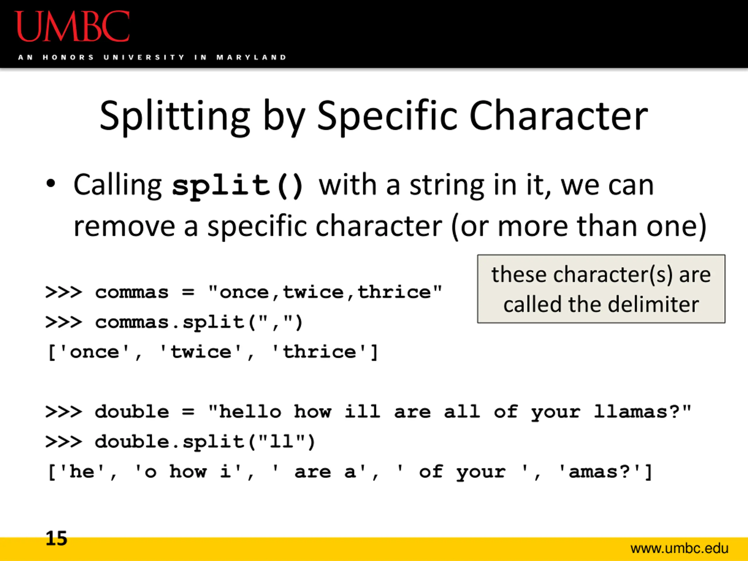 Splitting by Specific Character Calling split() with a string in it, we can remove a specific character (or more than one) these character(s) are called the delimiter >>> commas = "once,twice,thrice" >>> commas.split(",") ['once', 'twice', 'thrice'] >>> double = "hello how ill are all of your llamas?" >>> double.split("ll") ['he', 'o how i', ' are a', ' of your ', 'amas?'] notice that it didn t remove the whitespace 16 www.umbc.edu