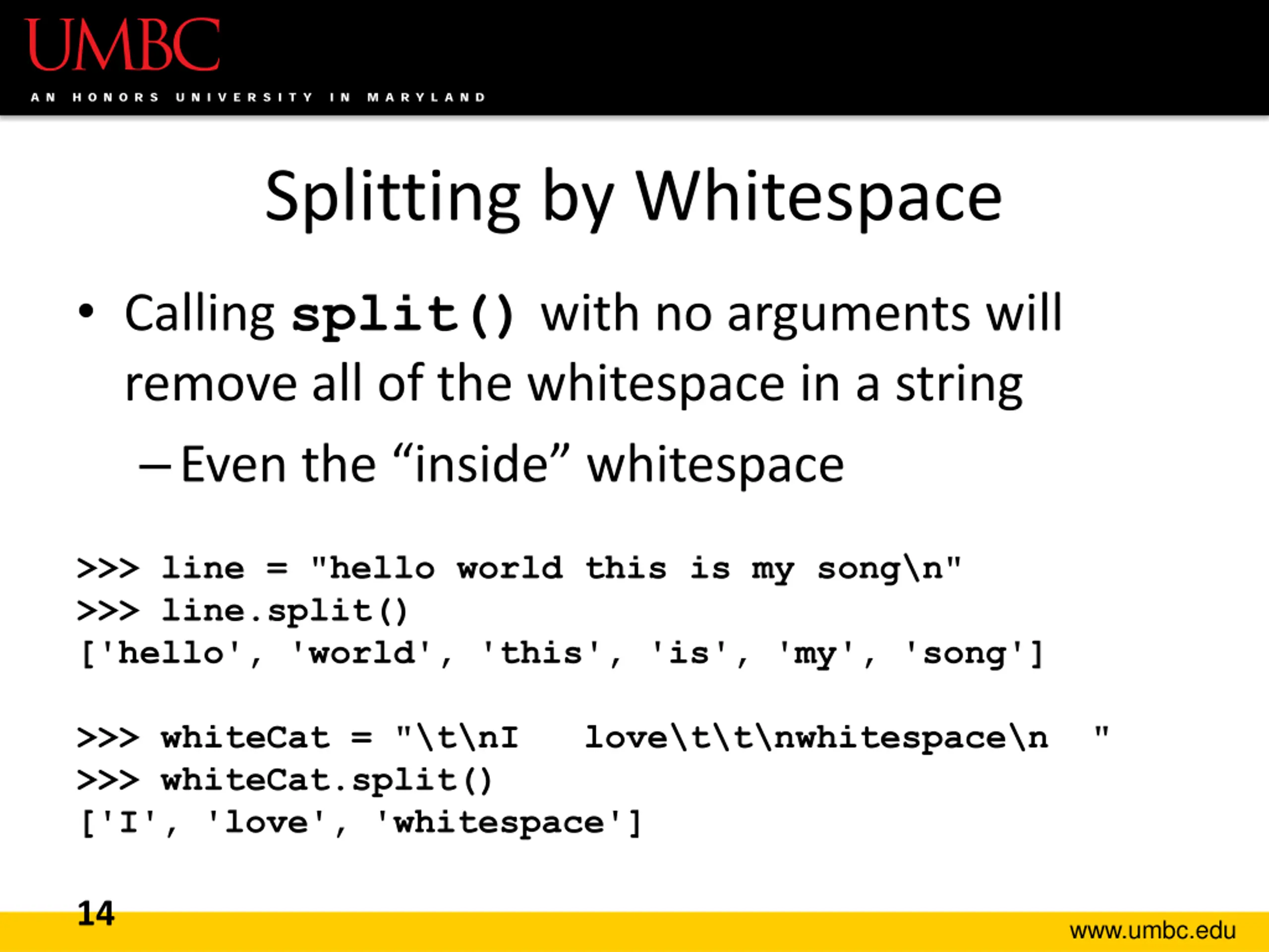 Splitting by Whitespace Calling split() with no arguments will remove all of the whitespace in a string Even the inside whitespace >>> line = "hello world this is my song\n" >>> line.split() ['hello', 'world', 'this', 'is', 'my', 'song'] >>> whiteCat = "\t\nI love\t\t\nwhitespace\n " >>> whiteCat.split() ['I', 'love', 'whitespace'] 14 www.umbc.edu