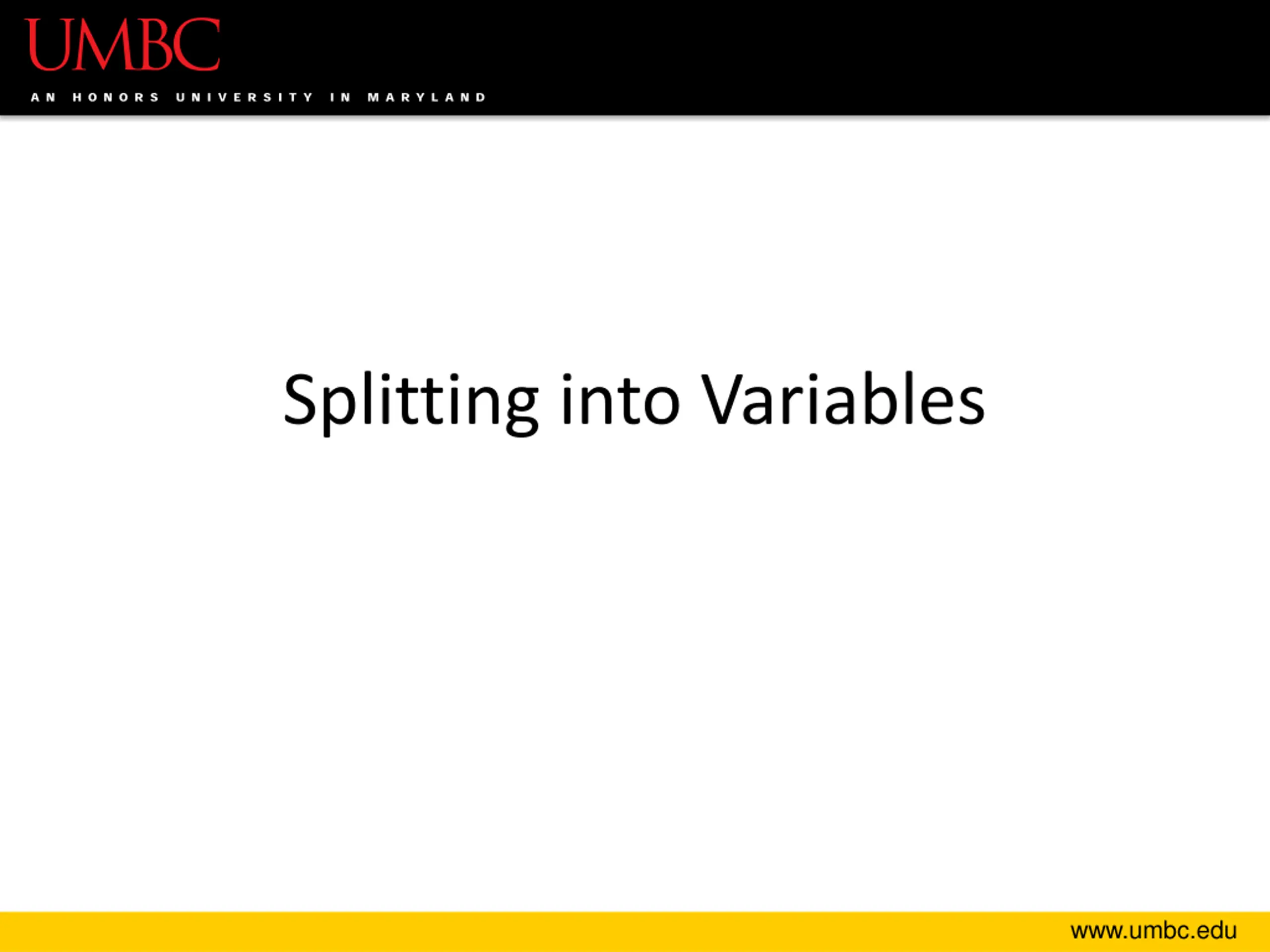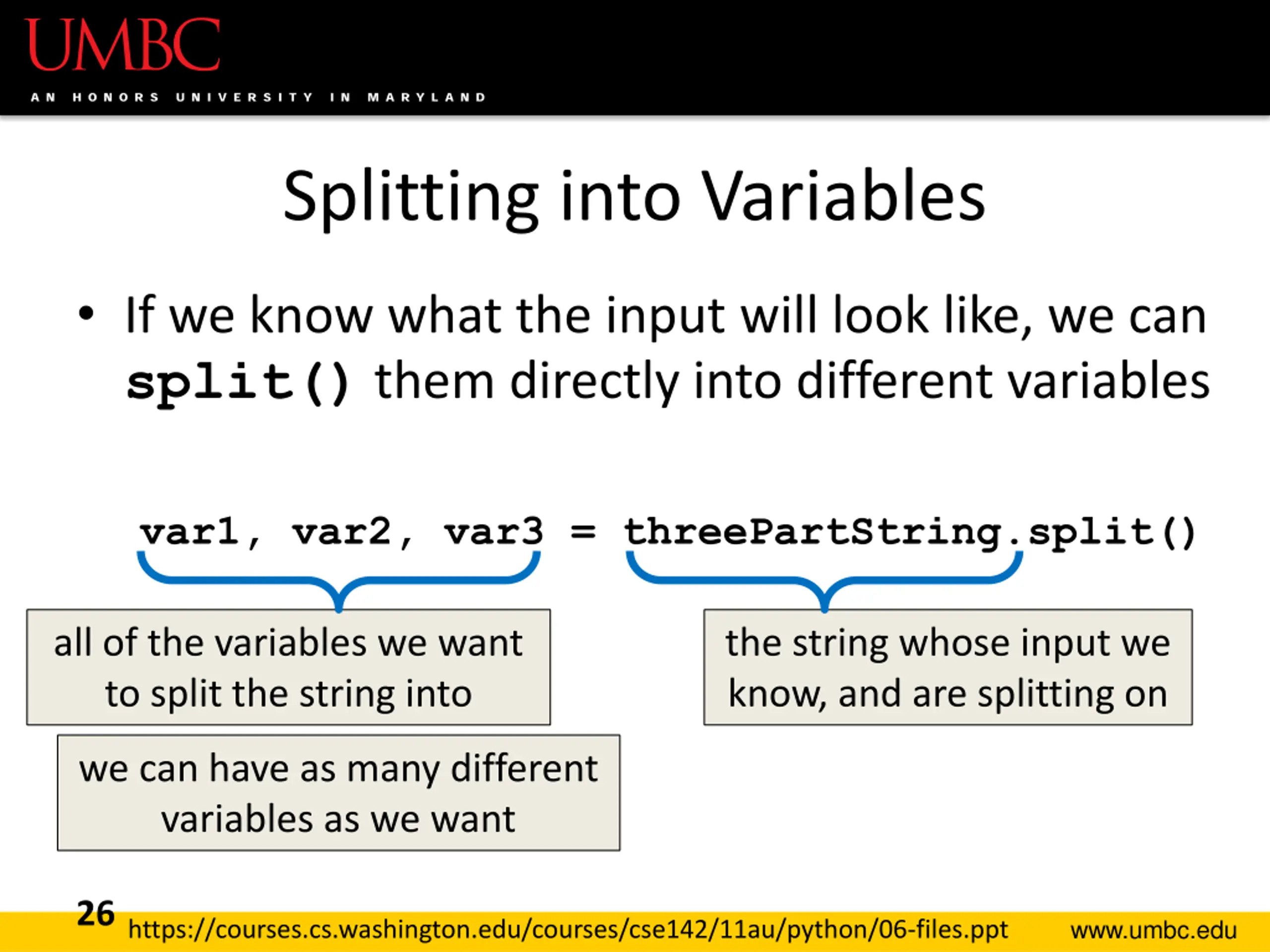 Splitting into Variables If we know what the input will look like, we can split() them directly into different variables var1, var2, var3 = threePartString.split() all of the variables we want to split the string into the string whose input we know, and are splitting on we can have as many different variables as we want 26 www.umbc.edu https://courses.cs.washington.edu/courses/cse142/11au/python/06-files.ppt