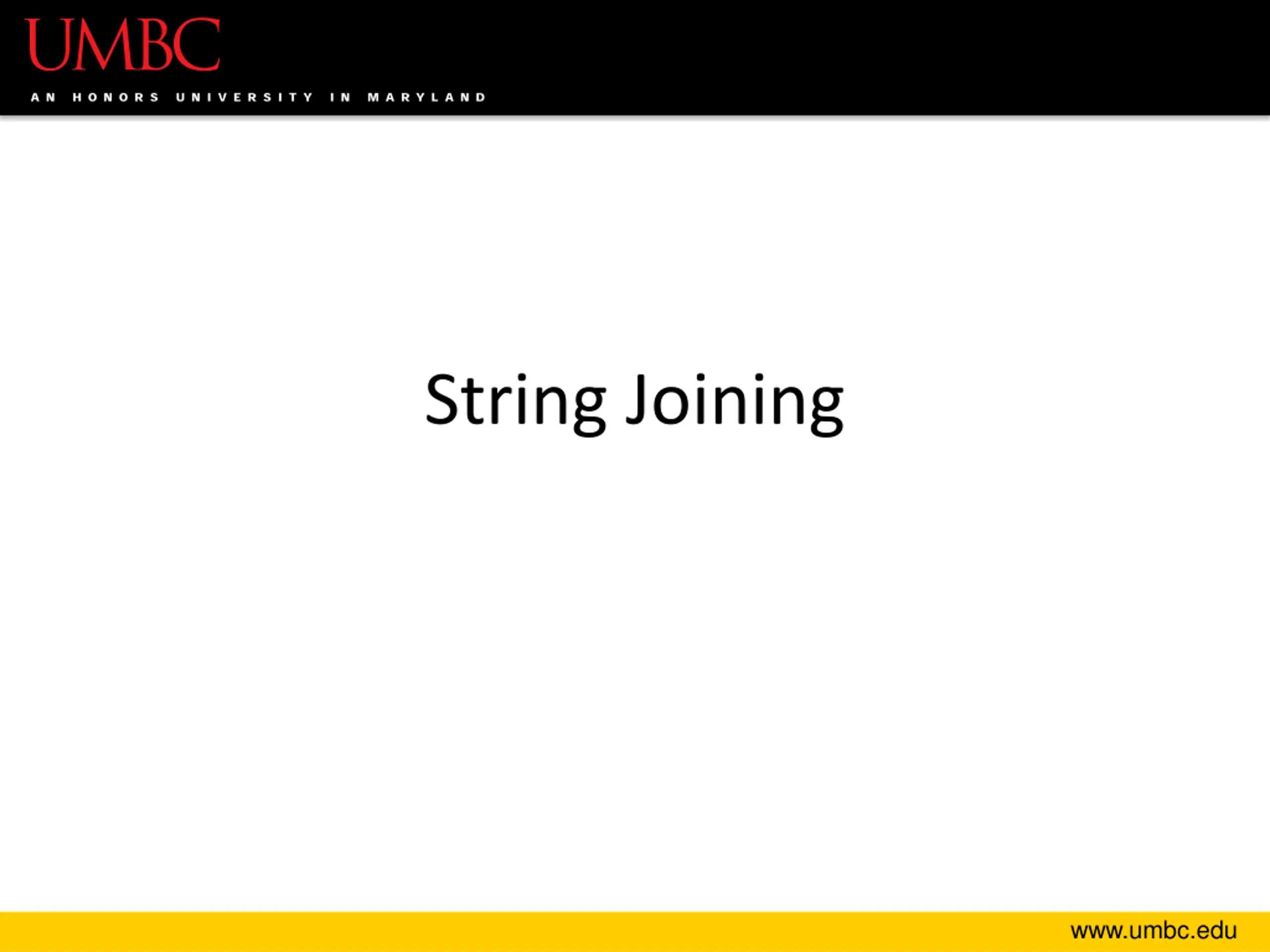 Joining Strings We can also join a list of strings back together! The syntax is very different from split() And it only works on a list of strings "X".join(LIST_OF_STRINGS) function name the list of strings we want to join together the delimiter (what we will use to join the strings) 22 www.umbc.edu