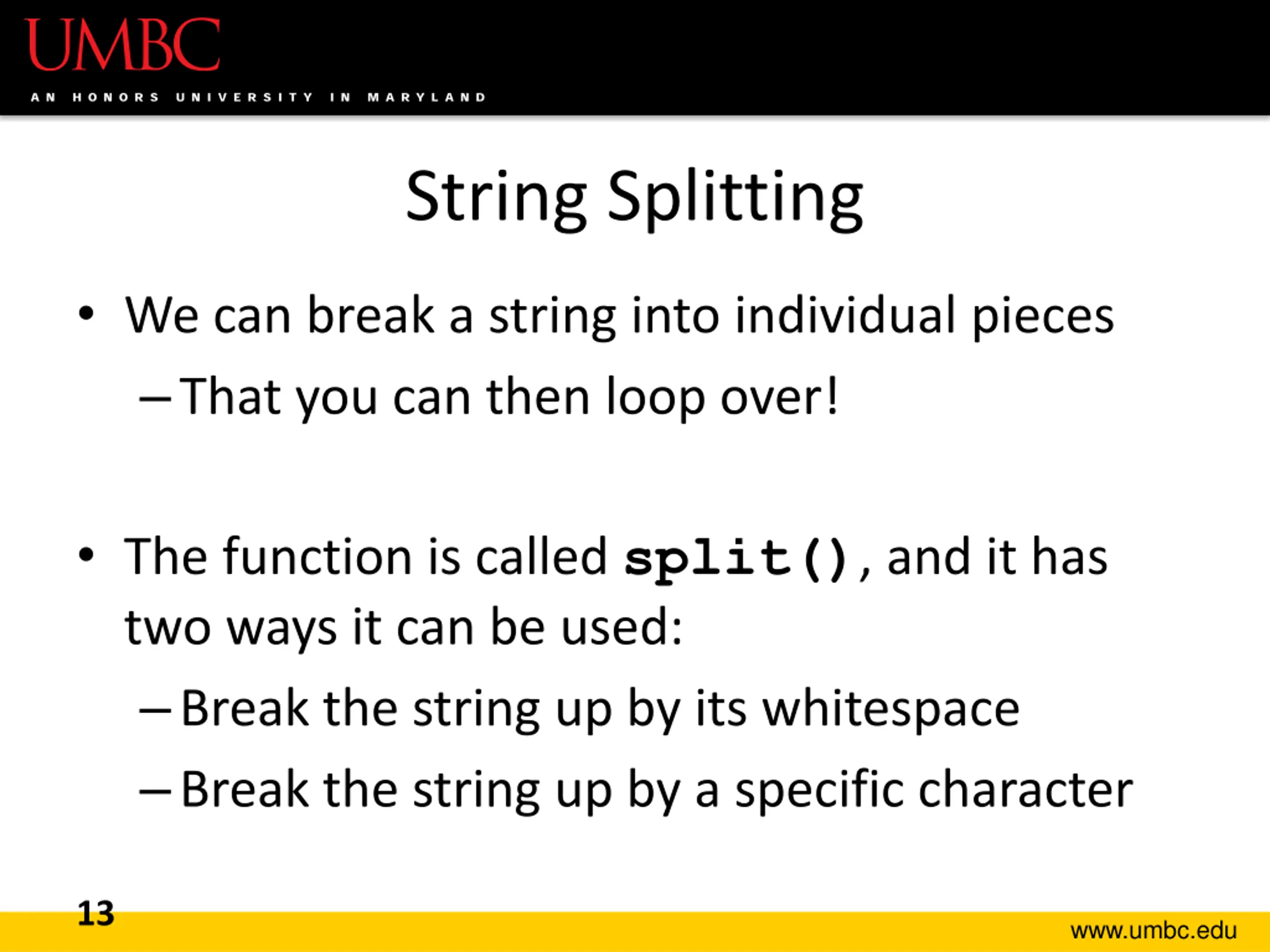 String Splitting We can break a string into individual pieces That you can then loop over! The function is called split(), and it has two ways it can be used: Break the string up by its whitespace Break the string up by a specific character 13 www.umbc.edu