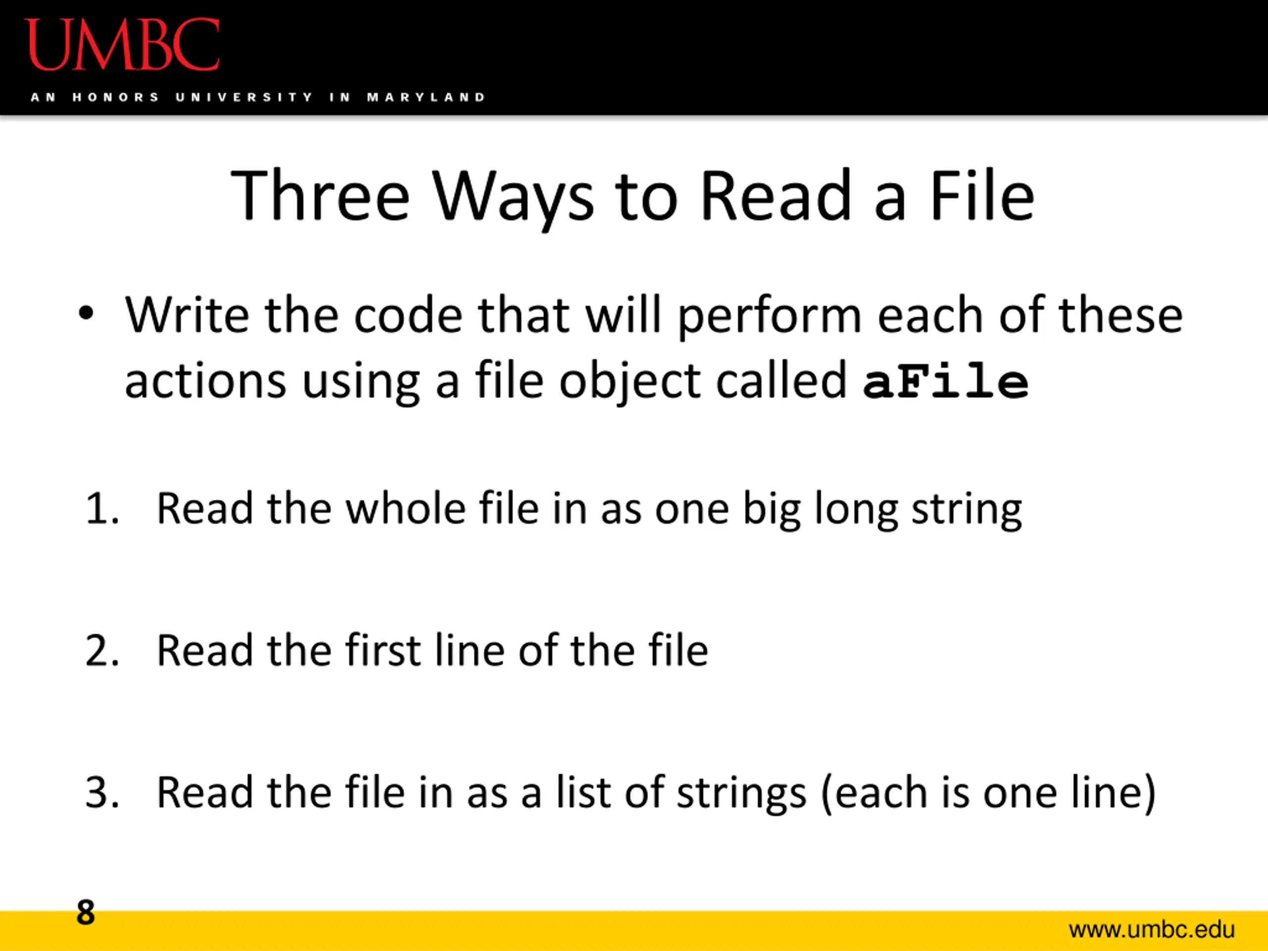 Three Ways to Read a File Write the code that will perform each of these actions using a file object called aFile 1. Read the whole file in as one big long string 2. Read the first line of the file 3. Read the file in as a list of strings (each is one line) 8 www.umbc.edu