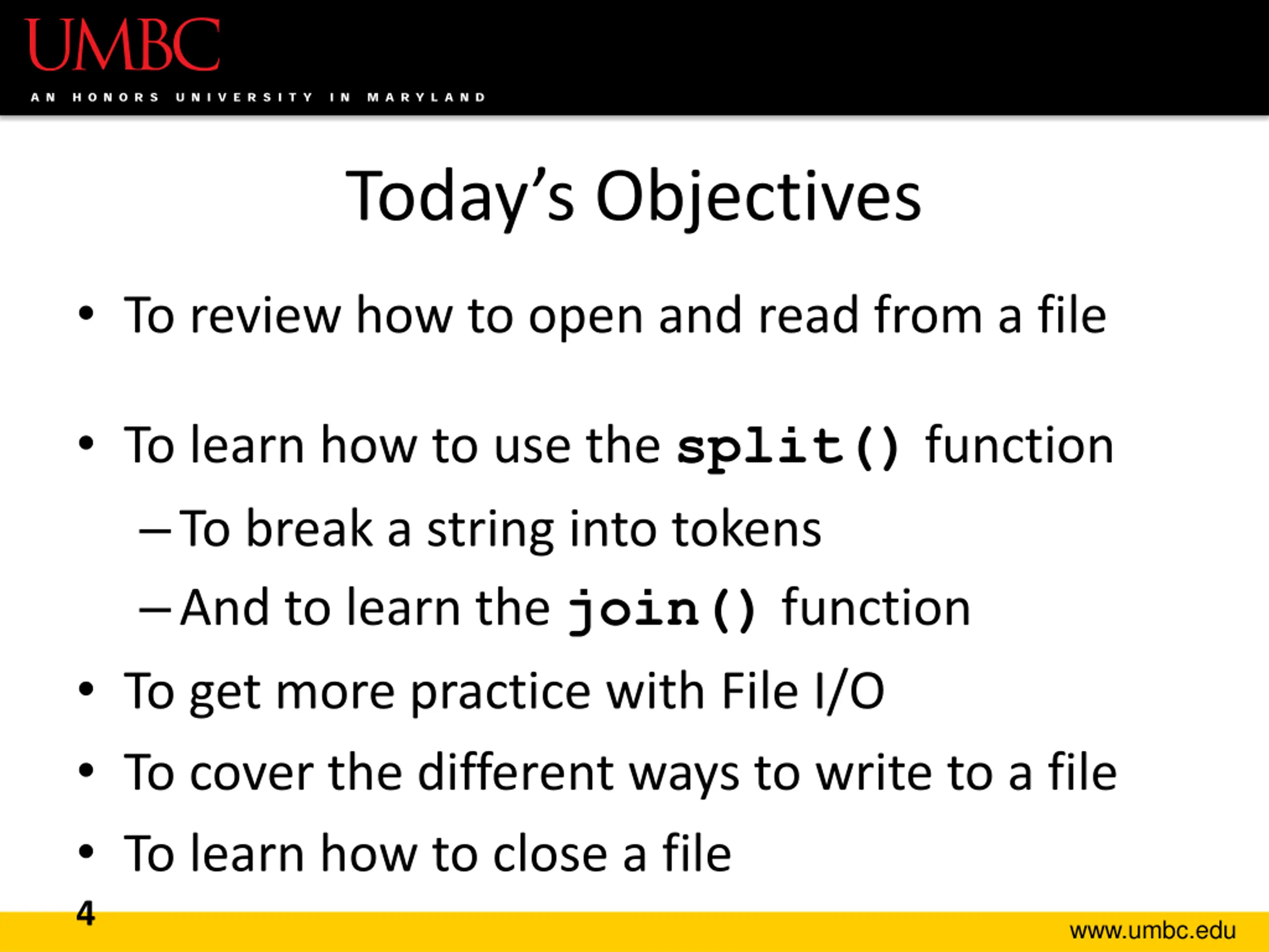 Todays Objectives To review how to open and read from a file To learn how to use the split() function To break a string into tokens And to learn the join() function To get more practice with File I/O To cover the different ways to write to a file To learn how to close a file 4 www.umbc.edu