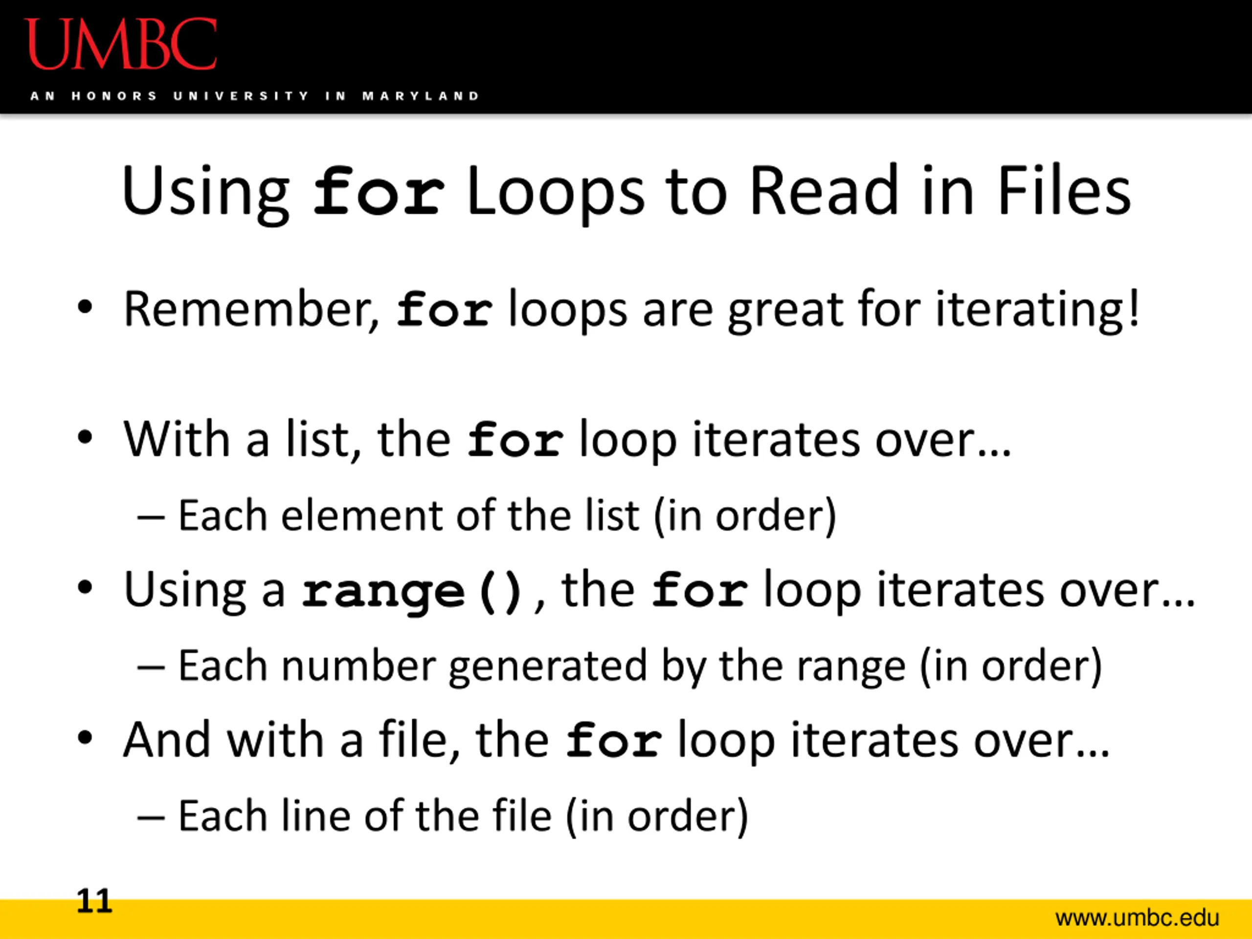 Using for Loops to Read in Files Remember, for loops are great for iterating! With a list, the forloop iterates over Each element of the list (in order) Using a range(), the forloop iterates over Each number generated by the range (in order) And with a file, the forloop iterates over Each line of the file (in order) 11 www.umbc.edu