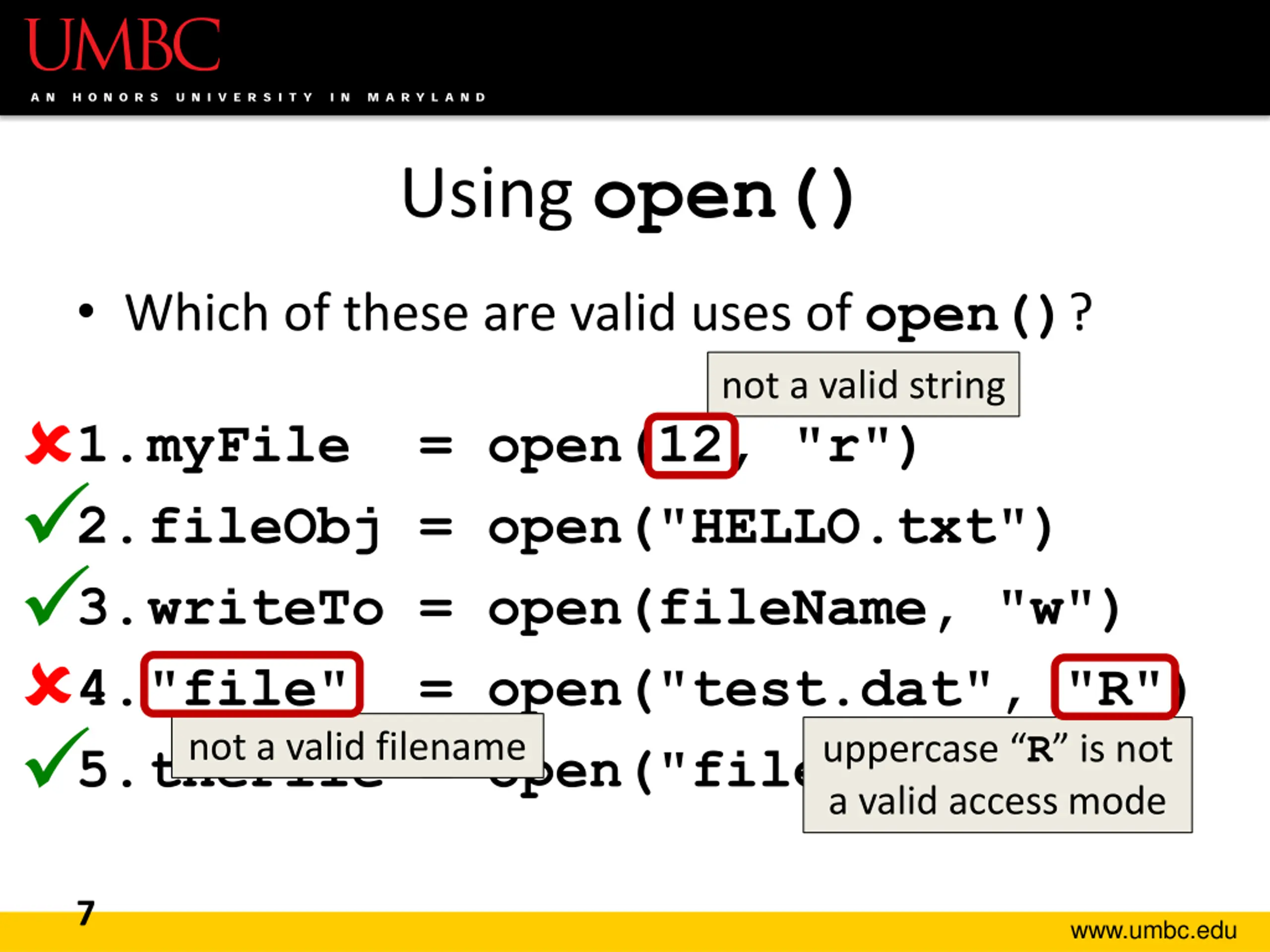 Using open() Which of these are valid uses of open()? 1.myFile = open(12, "r") 2.fileObj = open("HELLO.txt") 3.writeTo = open(fileName, "w") 4."file" = open("test.dat", "R") 5.theFile = open("file.dat", "a") 6 www.umbc.edu