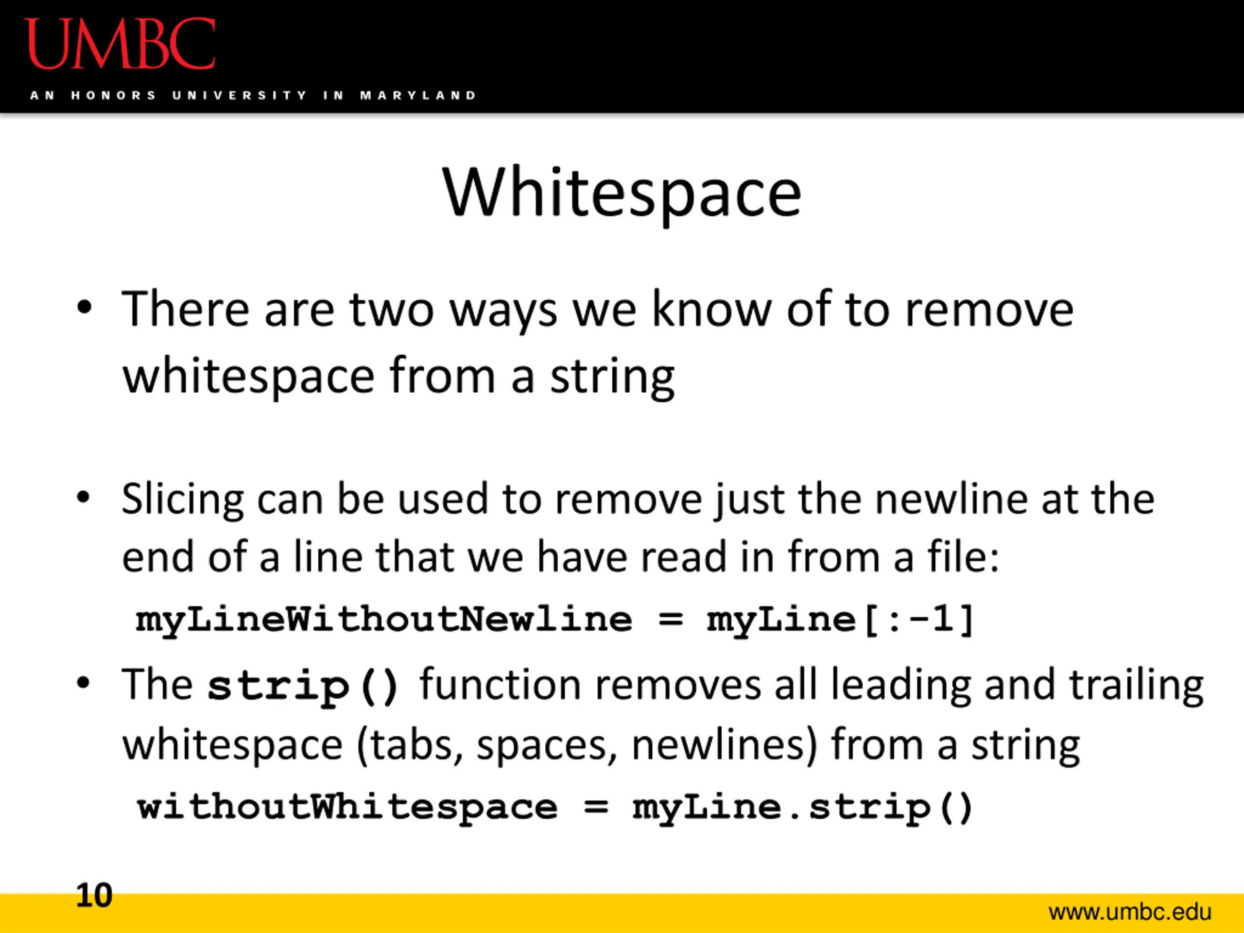 Whitespace There are two ways we know of to remove whitespace from a string Slicing can be used to remove just the newline at the end of a line that we have read in from a file: myLineWithoutNewline = myLine[:-1] The strip() function removes all leading and trailing whitespace (tabs, spaces, newlines) from a string withoutWhitespace = myLine.strip() 10 www.umbc.edu