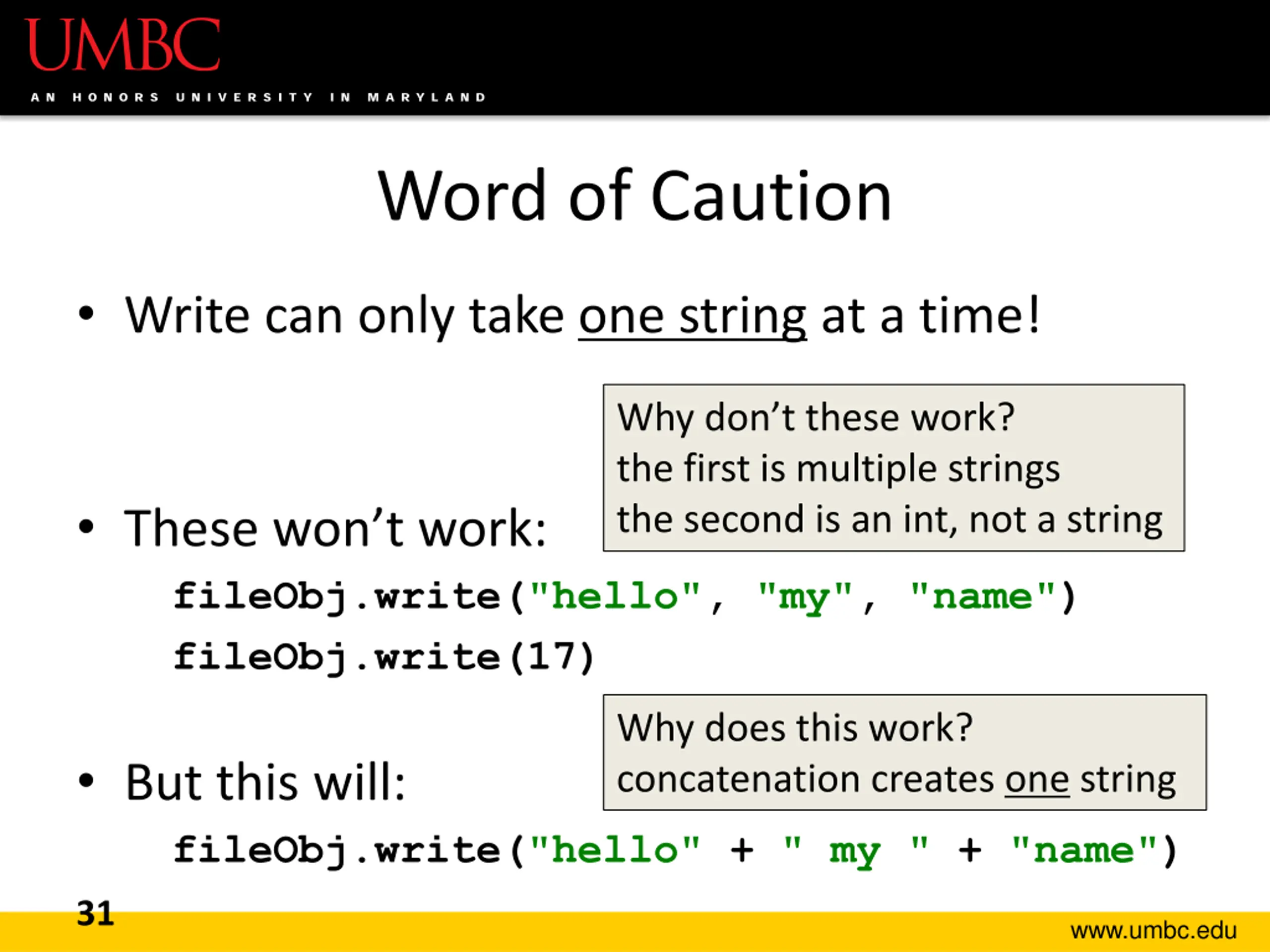 Word of Caution Write can only take one string at a time! Why don t these work? the first is multiple strings the second is an int, not a string These won t work: fileObj.write("hello", "my", "name") fileObj.write(17) Why does this work? concatenation creates one string But this will: fileObj.write("hello" + " my " + "name") 31 www.umbc.edu