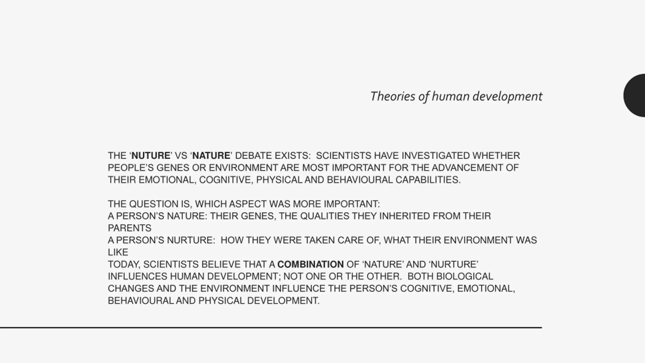 Theories of human development THE NUTURE VS NATURE DEBATE EXISTS: SCIENTISTS HAVE INVESTIGATED WHETHER PEOPLE S GENES OR ENVIRONMENT ARE MOST IMPORTANT FOR THE ADVANCEMENT OF THEIR EMOTIONAL, COGNITIVE, PHYSICAL AND BEHAVIOURAL CAPABILITIES. THE QUESTION IS, WHICH ASPECT WAS MORE IMPORTANT: A PERSON S NATURE: THEIR GENES, THE QUALITIES THEY INHERITED FROM THEIR PARENTS A PERSON S NURTURE: HOW THEY WERE TAKEN CARE OF, WHAT THEIR ENVIRONMENT WAS LIKE TODAY, SCIENTISTS BELIEVE THAT A COMBINATION OF NATURE AND NURTURE INFLUENCES HUMAN DEVELOPMENT; NOT ONE OR THE OTHER. BOTH BIOLOGICAL CHANGES AND THE ENVIRONMENT INFLUENCE THE PERSON S COGNITIVE, EMOTIONAL, BEHAVIOURAL AND PHYSICAL DEVELOPMENT.