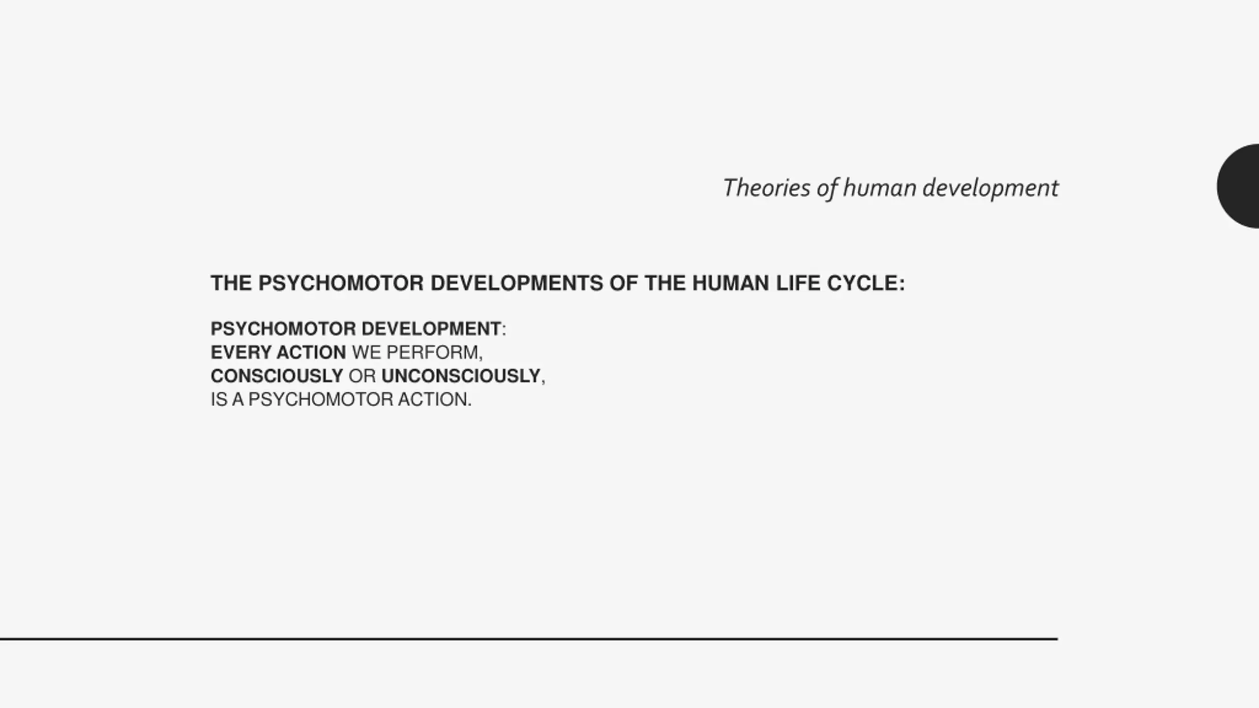 Theories of human development THE PSYCHOMOTOR DEVELOPMENTS OF THE HUMAN LIFE CYCLE: PSYCHOMOTOR DEVELOPMENT: EVERY ACTION WE PERFORM, CONSCIOUSLY OR UNCONSCIOUSLY, IS A PSYCHOMOTOR ACTION.