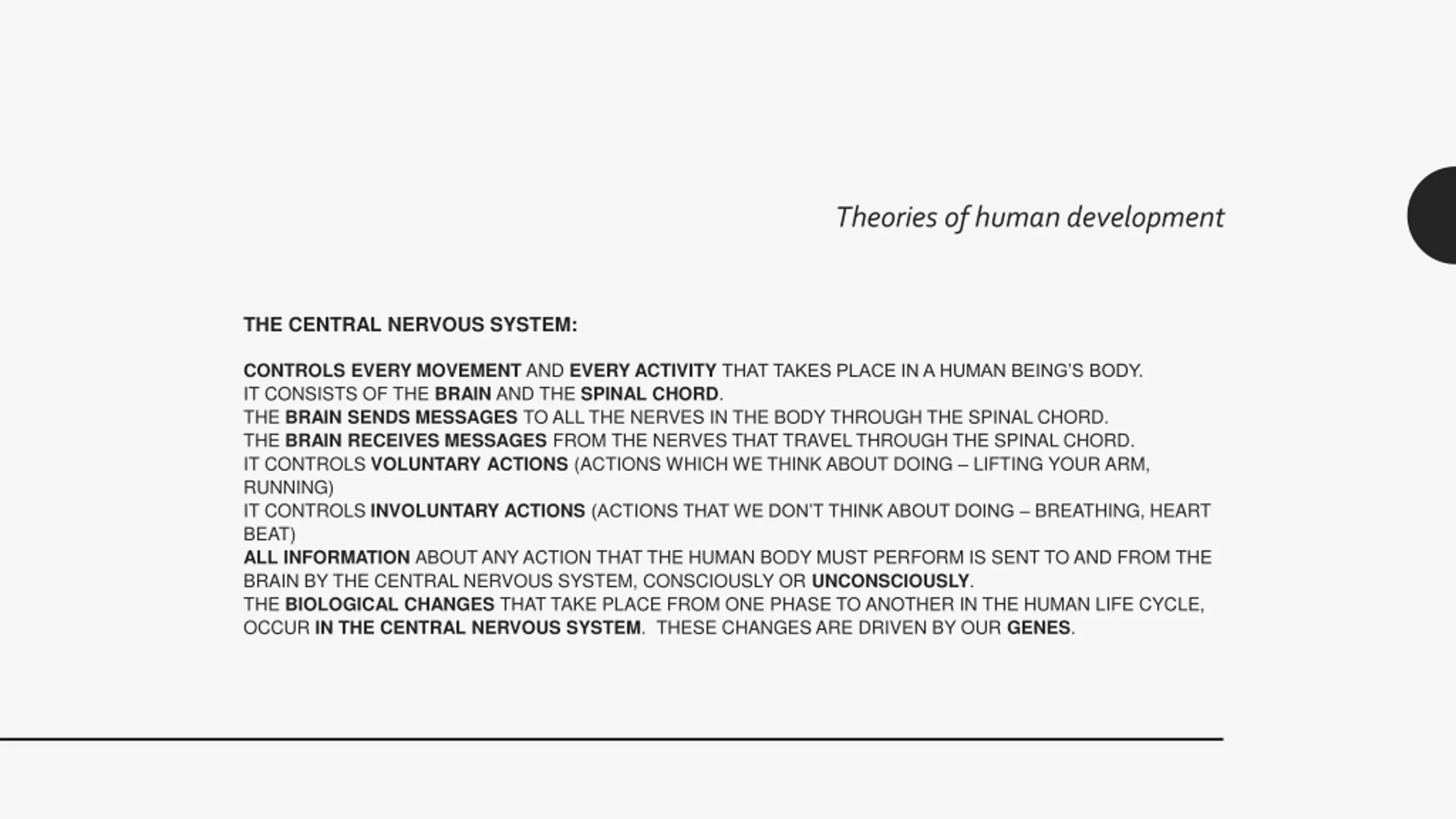 Theories of human development THE CENTRAL NERVOUS SYSTEM: CONTROLS EVERY MOVEMENT AND EVERY ACTIVITY THAT TAKES PLACE IN A HUMAN BEING S BODY. IT CONSISTS OF THE BRAIN AND THE SPINAL CHORD. THE BRAIN SENDS MESSAGES TO ALL THE NERVES IN THE BODY THROUGH THE SPINAL CHORD. THE BRAIN RECEIVES MESSAGES FROM THE NERVES THAT TRAVEL THROUGH THE SPINAL CHORD. IT CONTROLS VOLUNTARY ACTIONS (ACTIONS WHICH WE THINK ABOUT DOING LIFTING YOUR ARM, RUNNING) IT CONTROLS INVOLUNTARY ACTIONS (ACTIONS THAT WE DON T THINK ABOUT DOING BREATHING, HEART BEAT) ALL INFORMATION ABOUT ANY ACTION THAT THE HUMAN BODY MUST PERFORM IS SENT TO AND FROM THE BRAIN BY THE CENTRAL NERVOUS SYSTEM, CONSCIOUSLY OR UNCONSCIOUSLY. THE BIOLOGICAL CHANGES THAT TAKE PLACE FROM ONE PHASE TO ANOTHER IN THE HUMAN LIFE CYCLE, OCCUR IN THE CENTRAL NERVOUS SYSTEM. THESE CHANGES ARE DRIVEN BY OUR GENES.