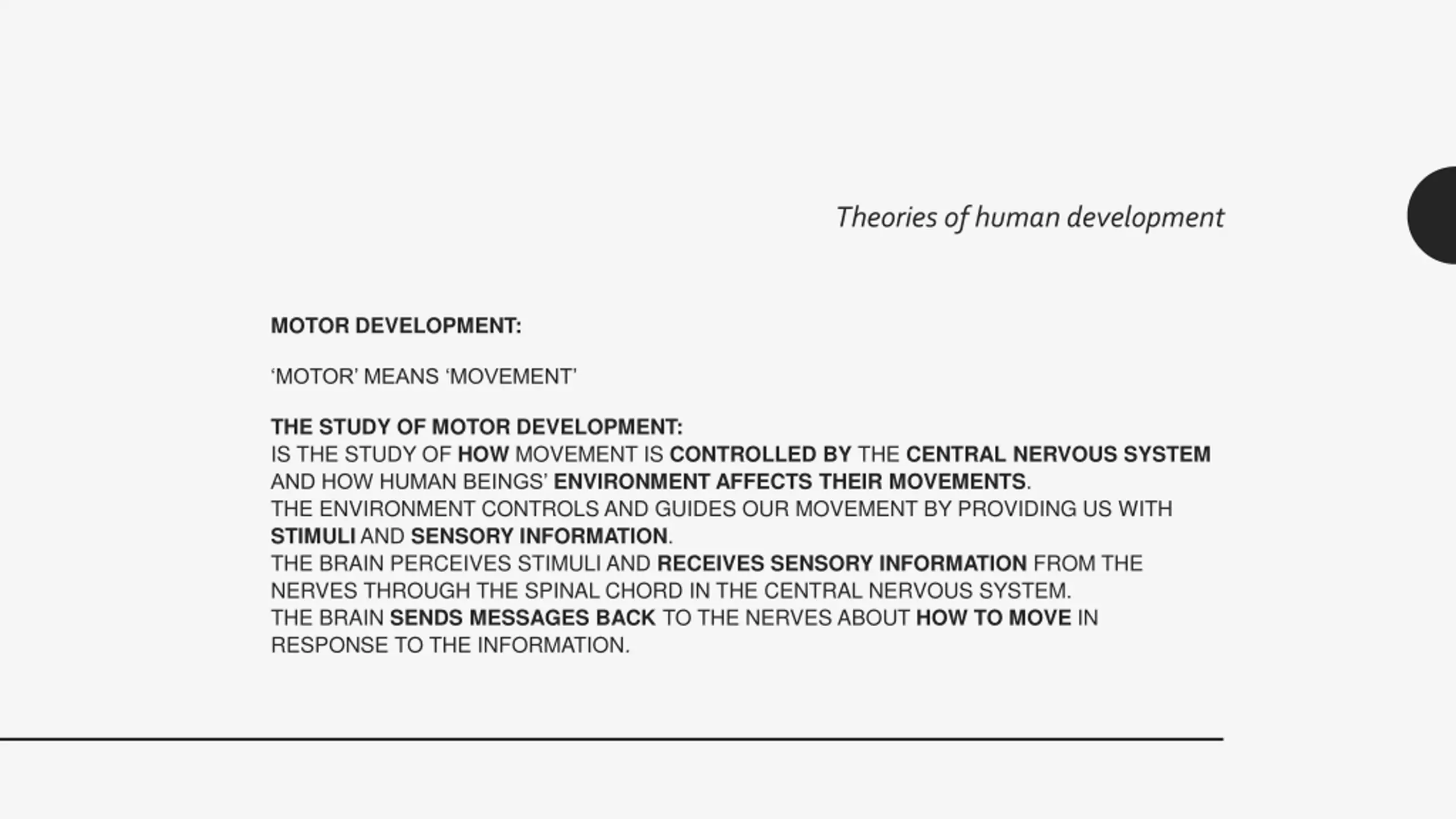 Theories of human development MOTOR DEVELOPMENT: MOTOR MEANS MOVEMENT THE STUDY OF MOTOR DEVELOPMENT: IS THE STUDY OF HOW MOVEMENT IS CONTROLLED BY THE CENTRAL NERVOUS SYSTEM AND HOW HUMAN BEINGS ENVIRONMENT AFFECTS THEIR MOVEMENTS. THE ENVIRONMENT CONTROLS AND GUIDES OUR MOVEMENT BY PROVIDING US WITH STIMULIAND SENSORY INFORMATION. THE BRAIN PERCEIVES STIMULI AND RECEIVES SENSORY INFORMATION FROM THE NERVES THROUGH THE SPINAL CHORD IN THE CENTRAL NERVOUS SYSTEM. THE BRAIN SENDS MESSAGES BACK TO THE NERVES ABOUT HOW TO MOVE IN RESPONSE TO THE INFORMATION.