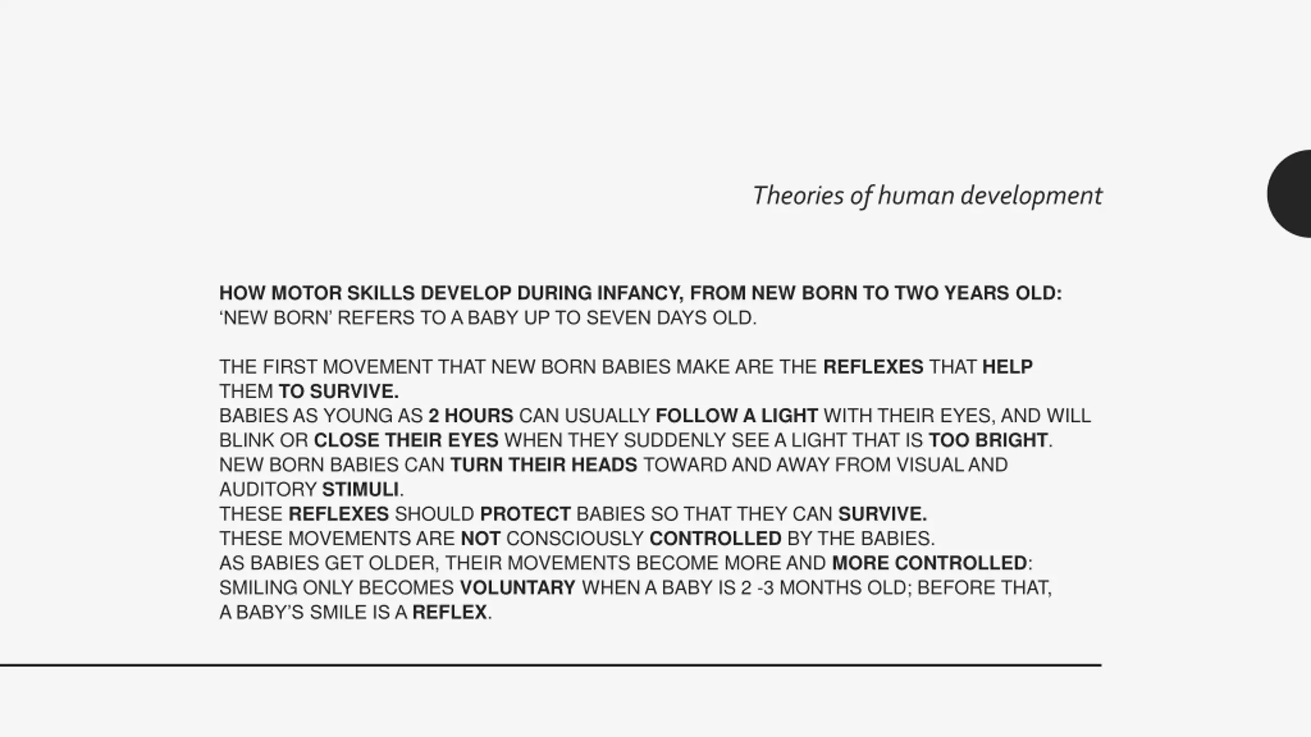 Theories of human development HOW MOTOR SKILLS DEVELOP DURING INFANCY, FROM NEW BORN TO TWO YEARS OLD: NEW BORN REFERS TO A BABY UP TO SEVEN DAYS OLD. THE FIRST MOVEMENT THAT NEW BORN BABIES MAKE ARE THE REFLEXES THAT HELP THEM TO SURVIVE. BABIES AS YOUNG AS 2 HOURS CAN USUALLY FOLLOW A LIGHT WITH THEIR EYES, AND WILL BLINK OR CLOSE THEIR EYES WHEN THEY SUDDENLY SEE A LIGHT THAT IS TOO BRIGHT. NEW BORN BABIES CAN TURN THEIR HEADS TOWARD AND AWAY FROM VISUAL AND AUDITORY STIMULI. THESE REFLEXES SHOULD PROTECT BABIES SO THAT THEY CAN SURVIVE. THESE MOVEMENTS ARE NOT CONSCIOUSLY CONTROLLED BY THE BABIES. AS BABIES GET OLDER, THEIR MOVEMENTS BECOME MORE AND MORE CONTROLLED: SMILING ONLY BECOMES VOLUNTARY WHEN A BABY IS 2 -3 MONTHS OLD; BEFORE THAT, A BABY S SMILE IS A REFLEX.