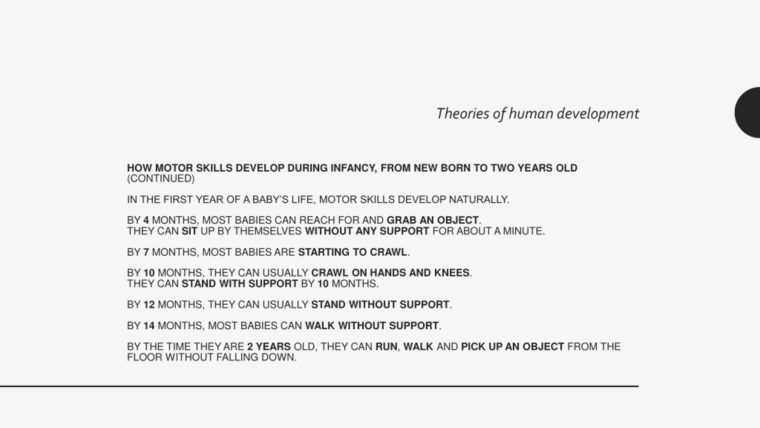 Theories of human development HOW MOTOR SKILLS DEVELOP DURING INFANCY, FROM NEW BORN TO TWO YEARS OLD (CONTINUED) IN THE FIRST YEAR OF A BABY S LIFE, MOTOR SKILLS DEVELOP NATURALLY. BY 4 MONTHS, MOST BABIES CAN REACH FOR AND GRAB AN OBJECT. THEY CAN SIT UP BY THEMSELVES WITHOUT ANY SUPPORT FOR ABOUT A MINUTE. BY 7 MONTHS, MOST BABIES ARE STARTING TO CRAWL. BY 10 MONTHS, THEY CAN USUALLY CRAWL ON HANDS AND KNEES. THEY CAN STAND WITH SUPPORT BY 10 MONTHS. BY 12 MONTHS, THEY CAN USUALLY STAND WITHOUT SUPPORT. BY 14 MONTHS, MOST BABIES CAN WALK WITHOUT SUPPORT. BY THE TIME THEY ARE 2 YEARS OLD, THEY CAN RUN, WALK AND PICK UP AN OBJECT FROM THE FLOOR WITHOUT FALLING DOWN.