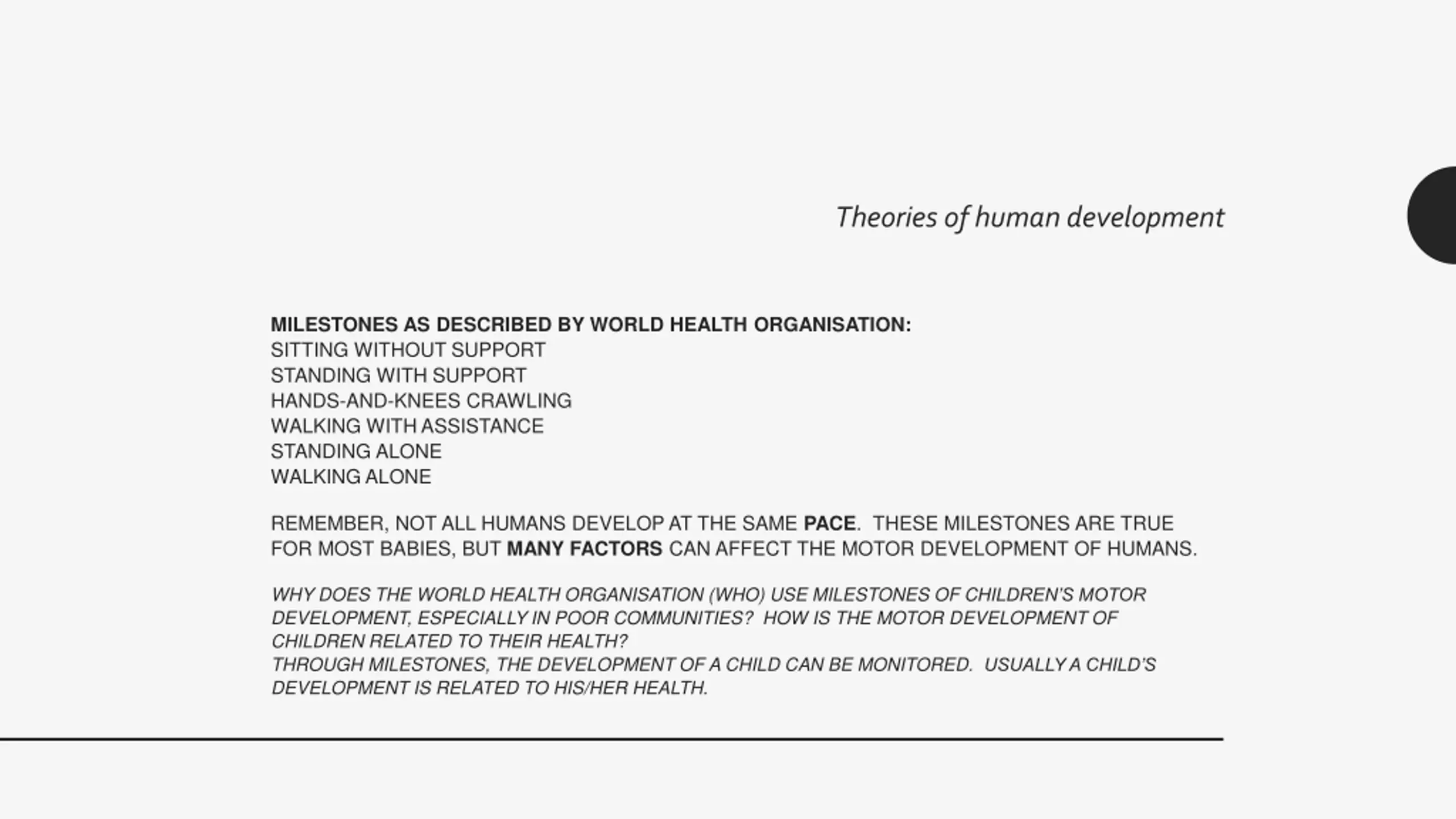 Theories of human development MILESTONES AS DESCRIBED BY WORLD HEALTH ORGANISATION: SITTING WITHOUT SUPPORT STANDING WITH SUPPORT HANDS-AND-KNEES CRAWLING WALKING WITH ASSISTANCE STANDING ALONE WALKING ALONE REMEMBER, NOT ALL HUMANS DEVELOP AT THE SAME PACE. THESE MILESTONES ARE TRUE FOR MOST BABIES, BUT MANY FACTORS CAN AFFECT THE MOTOR DEVELOPMENT OF HUMANS. WHY DOES THE WORLD HEALTH ORGANISATION (WHO) USE MILESTONES OF CHILDREN S MOTOR DEVELOPMENT, ESPECIALLY IN POOR COMMUNITIES? HOW IS THE MOTOR DEVELOPMENT OF CHILDREN RELATED TO THEIR HEALTH? THROUGH MILESTONES, THE DEVELOPMENT OF A CHILD CAN BE MONITORED. USUALLY A CHILD S DEVELOPMENT IS RELATED TO HIS/HER HEALTH.