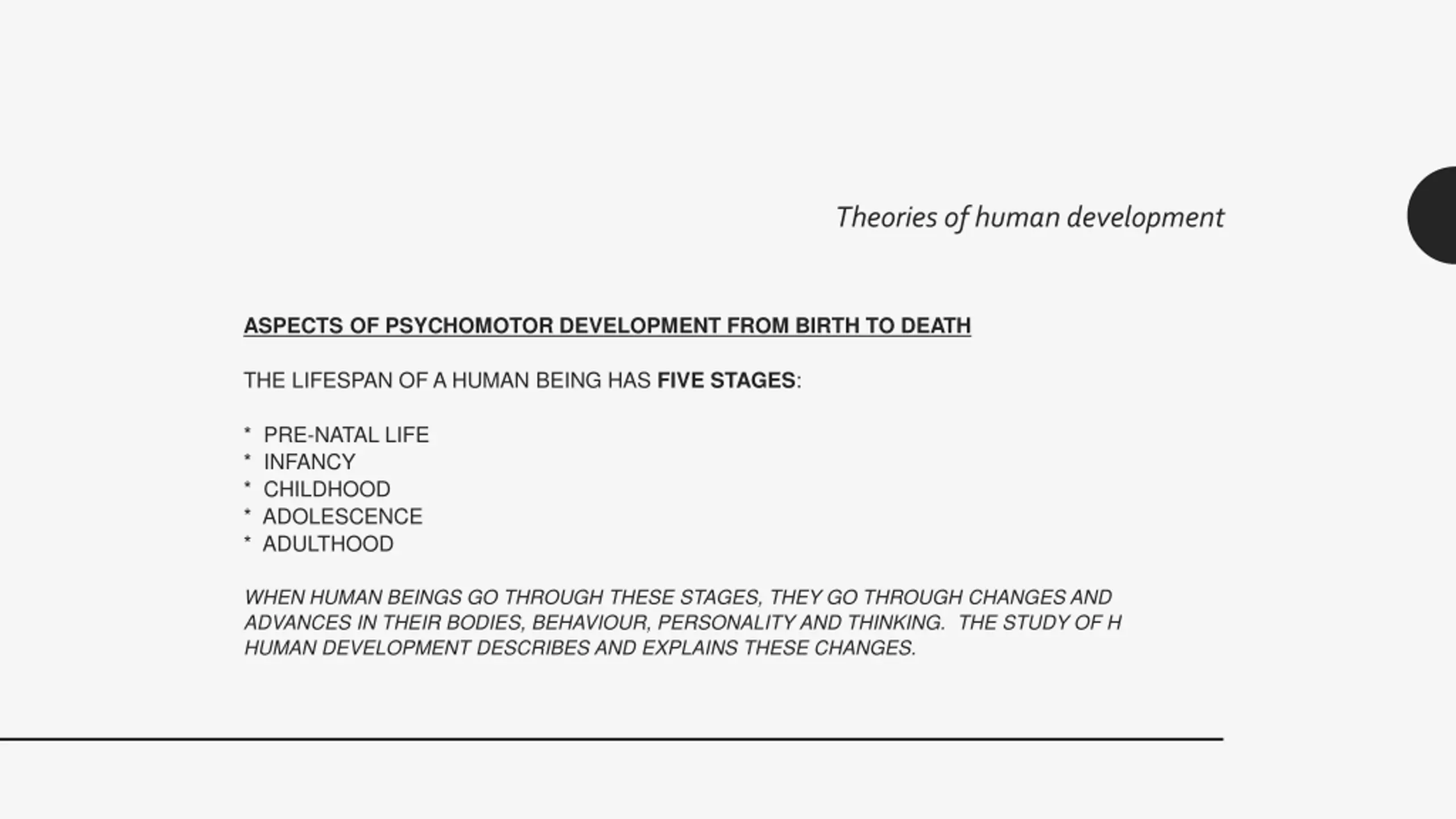 Theories of human development ASPECTS OF PSYCHOMOTOR DEVELOPMENT FROM BIRTH TO DEATH THE LIFESPAN OF A HUMAN BEING HAS FIVE STAGES: * PRE-NATAL LIFE * INFANCY * CHILDHOOD * ADOLESCENCE * ADULTHOOD WHEN HUMAN BEINGS GO THROUGH THESE STAGES, THEY GO THROUGH CHANGES AND ADVANCES IN THEIR BODIES, BEHAVIOUR, PERSONALITY AND THINKING. THE STUDY OF H HUMAN DEVELOPMENT DESCRIBES AND EXPLAINS THESE CHANGES.