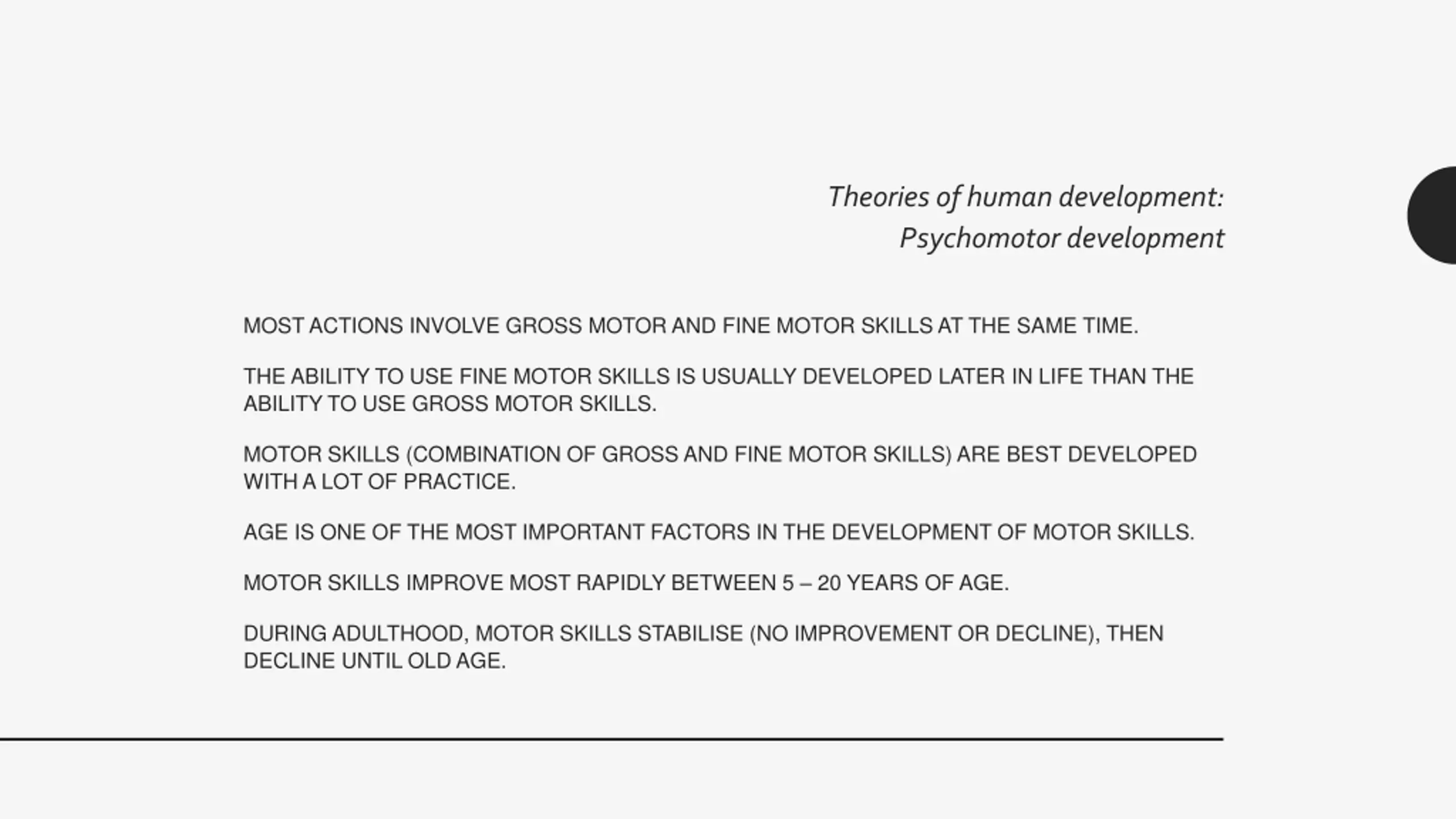 Theories of human development: Psychomotor development MOST ACTIONS INVOLVE GROSS MOTOR AND FINE MOTOR SKILLS AT THE SAME TIME. THE ABILITY TO USE FINE MOTOR SKILLS IS USUALLY DEVELOPED LATER IN LIFE THAN THE ABILITY TO USE GROSS MOTOR SKILLS. MOTOR SKILLS (COMBINATION OF GROSS AND FINE MOTOR SKILLS) ARE BEST DEVELOPED WITH A LOT OF PRACTICE. AGE IS ONE OF THE MOST IMPORTANT FACTORS IN THE DEVELOPMENT OF MOTOR SKILLS. MOTOR SKILLS IMPROVE MOST RAPIDLY BETWEEN 5 20 YEARS OF AGE. DURING ADULTHOOD, MOTOR SKILLS STABILISE (NO IMPROVEMENT OR DECLINE), THEN DECLINE UNTIL OLD AGE.