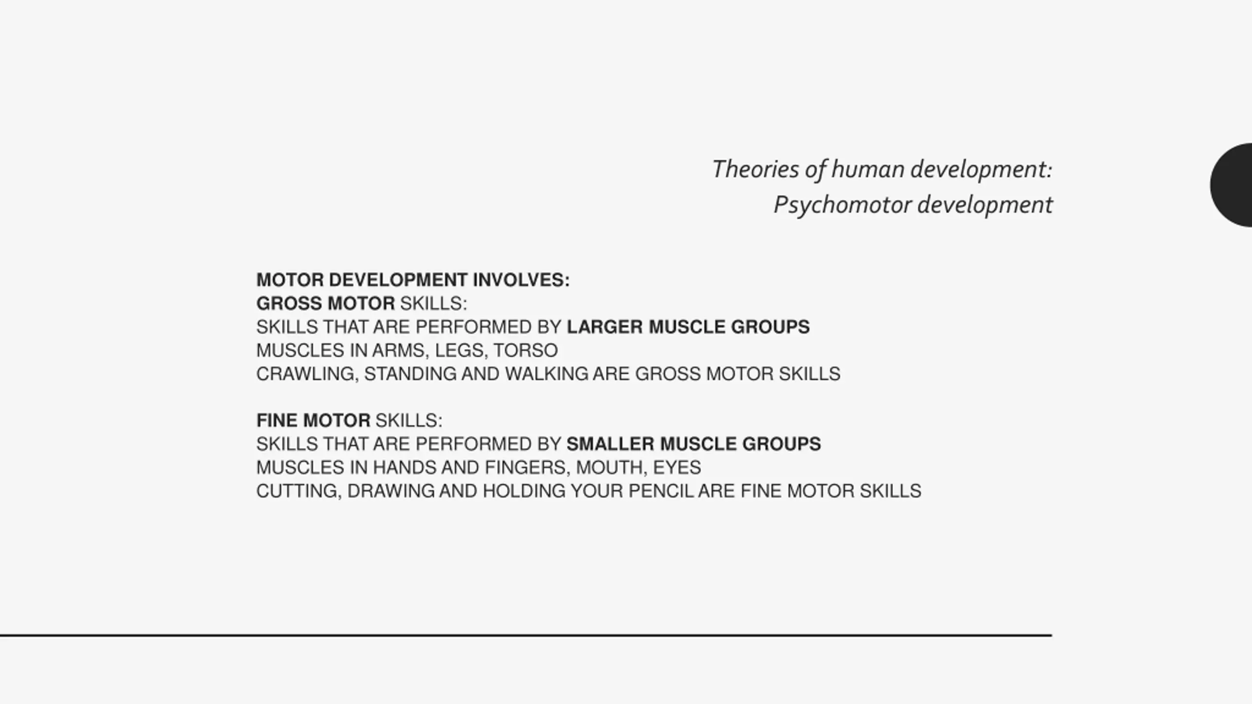 Theories of human development: Psychomotor development MOTOR DEVELOPMENT INVOLVES: GROSS MOTOR SKILLS: SKILLS THAT ARE PERFORMED BY LARGER MUSCLE GROUPS MUSCLES IN ARMS, LEGS, TORSO CRAWLING, STANDING AND WALKING ARE GROSS MOTOR SKILLS FINE MOTOR SKILLS: SKILLS THAT ARE PERFORMED BY SMALLER MUSCLE GROUPS MUSCLES IN HANDS AND FINGERS, MOUTH, EYES CUTTING, DRAWING AND HOLDING YOUR PENCIL ARE FINE MOTOR SKILLS